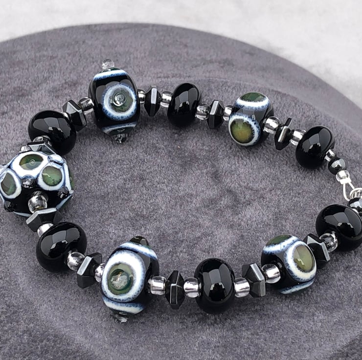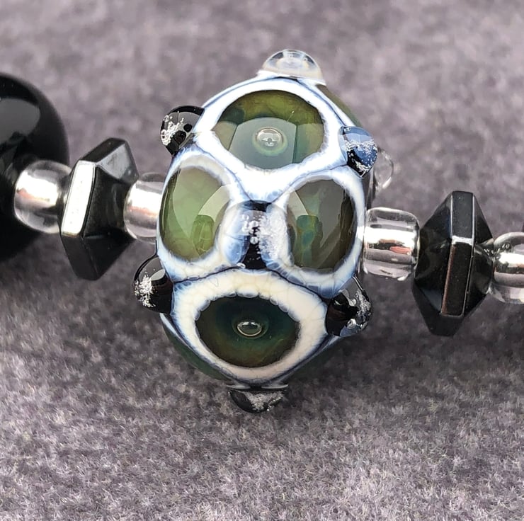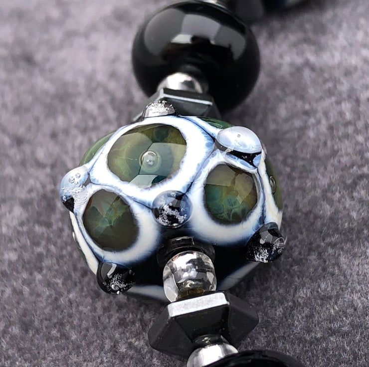 The five patterned beads are between 13-16mm in diameter, the ivory cream and green glass spots have reacted with the black glass base to give a gorgeous webbed appearance. The centre of the green glass has a trapped air bubble within it, in addition to this, some of the beads have bumps of clear glass added in a design that compliments the bead pattern.