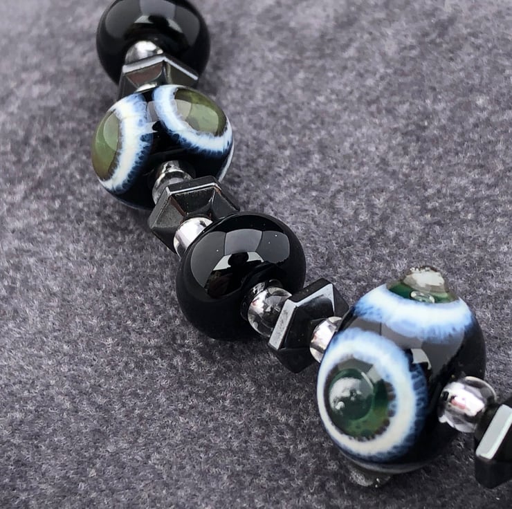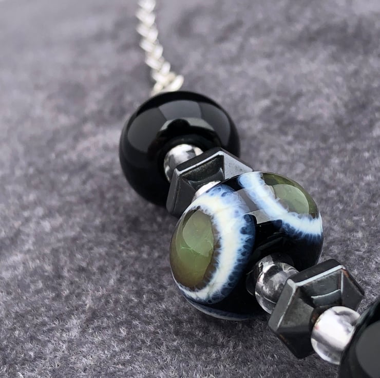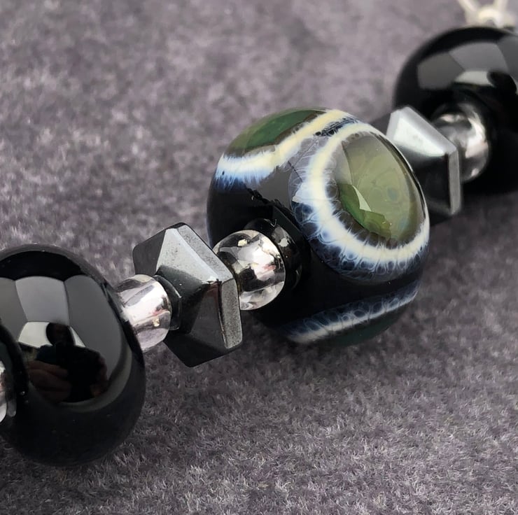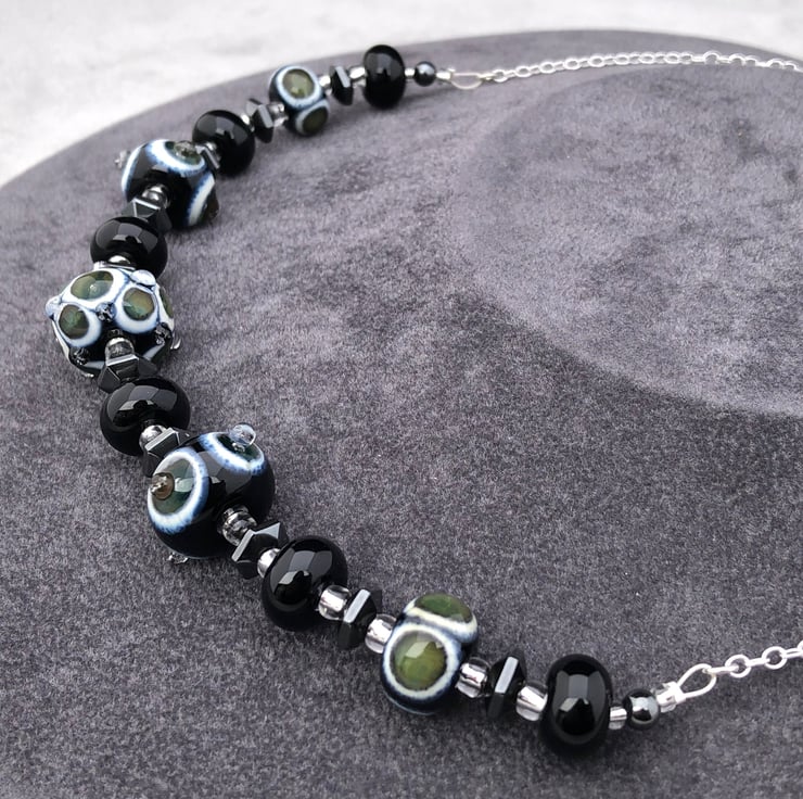 I have used 11 of my handcrafted lampwork glass beads and haematite stones in creating this unusual necklace.