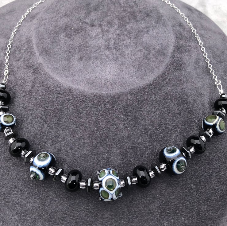 black, green and ivory cream spotted lampwork glass and haematite bead necklace
