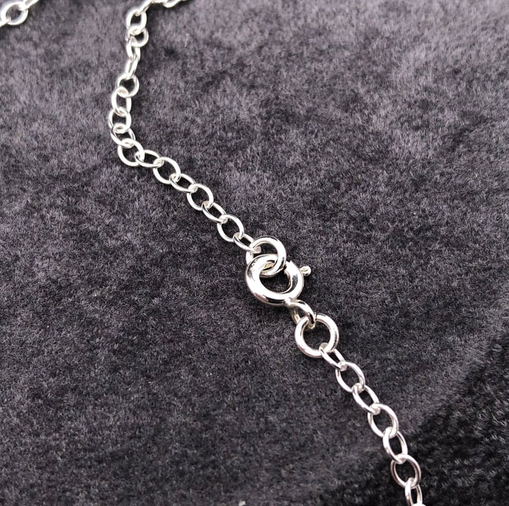The necklace with its Sterling Silver chain and spring ring clasp is approximately 18" in length.