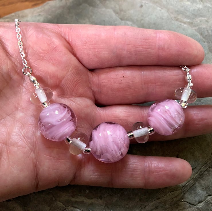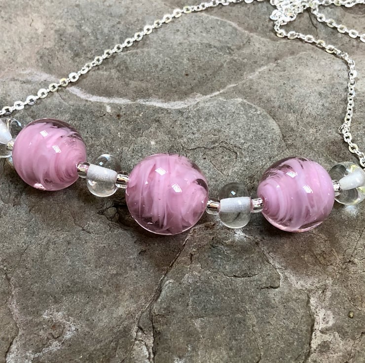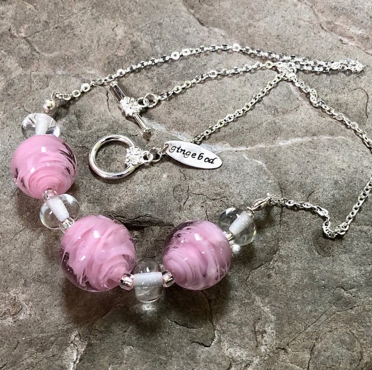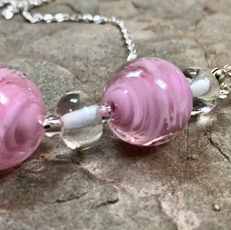 This necklace is designed with my own pink swirled marble shaped lampwork glass beads that remind me of funfair candy floss, combined with plain clear lampwork glass beads and silver lined seed beads.