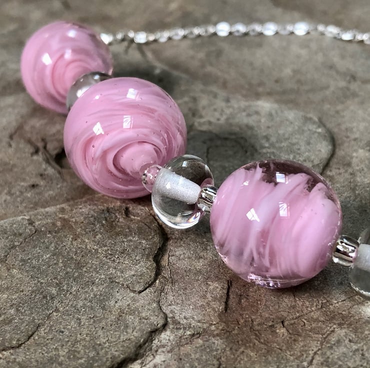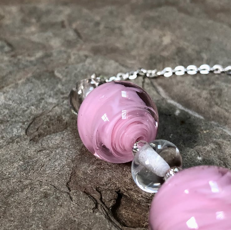 The main beads have been created using pink glass which has been swirled within clear glass then shaped in a graphite press whilst the glass is molten to create my own glass marbles (17mm-19mm in diameter)