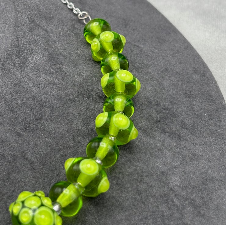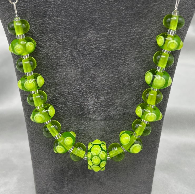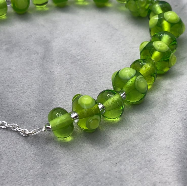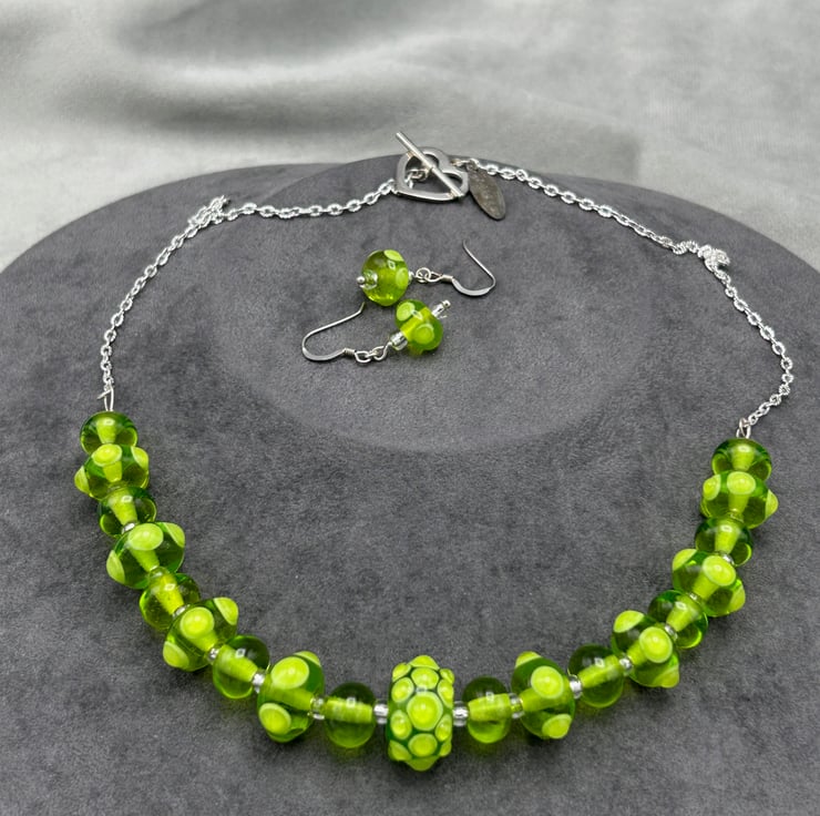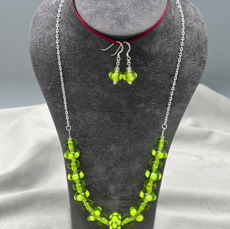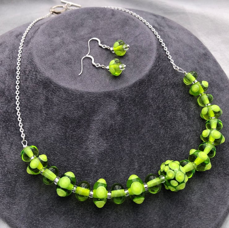 This is a striking bright green lampwork glass beaded necklace and earring set, made using 21 of my own handmade glass beads with bumps and spots of glass on the accent beads. The set really is eye catching and will draw comments from all that see it!