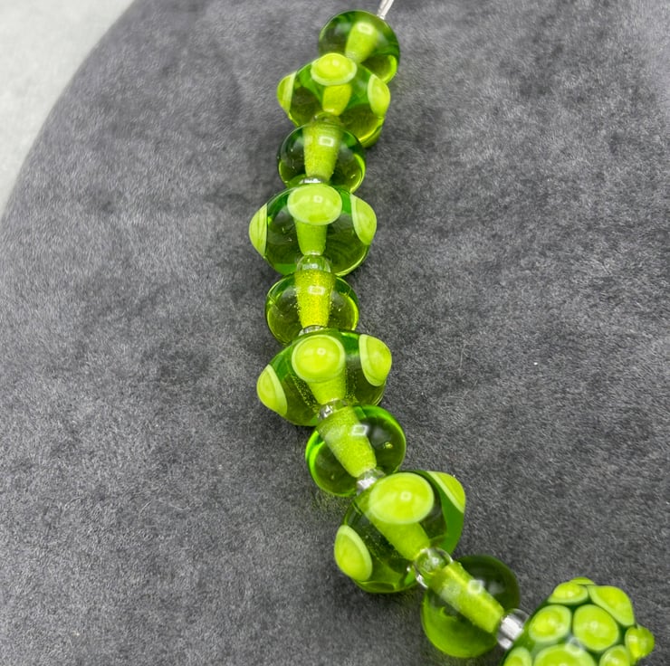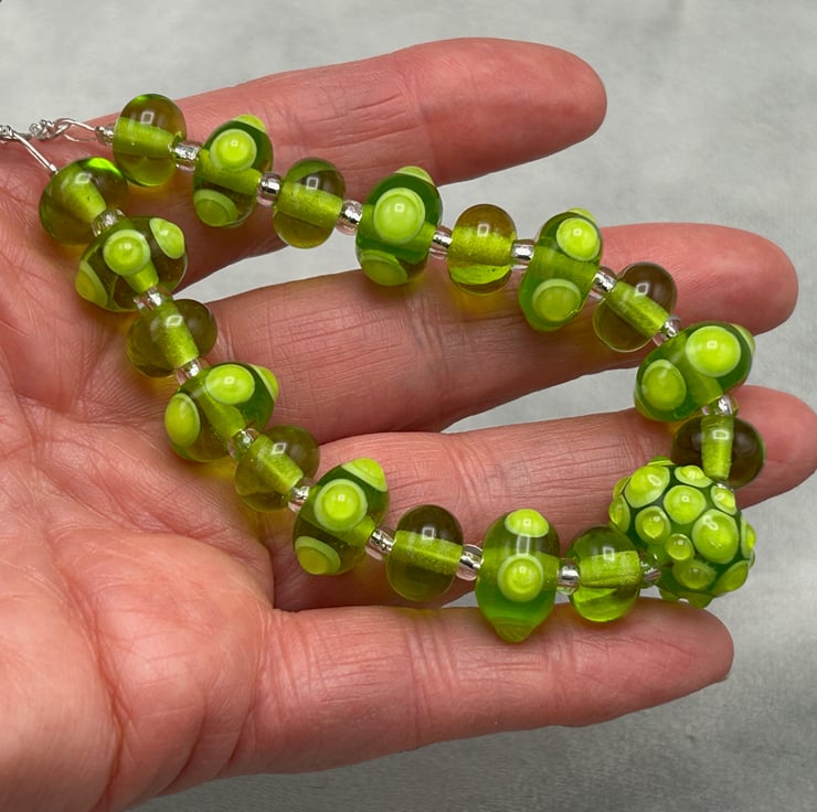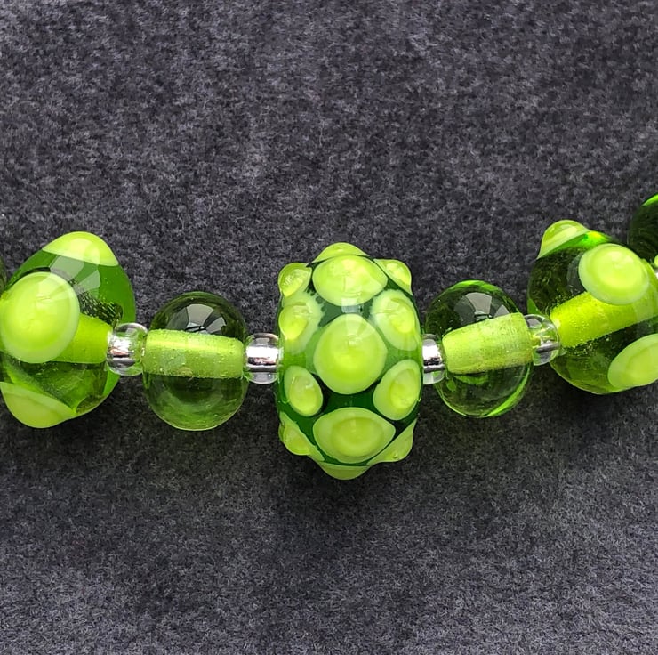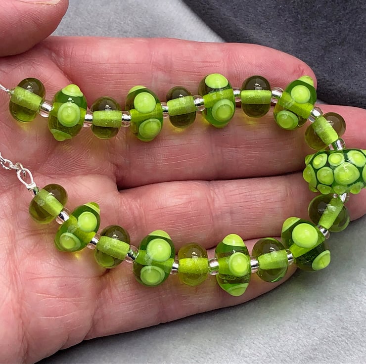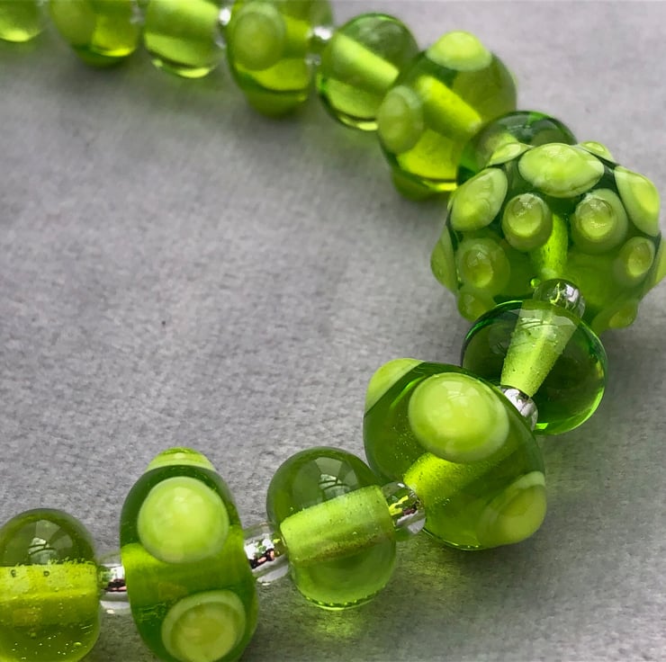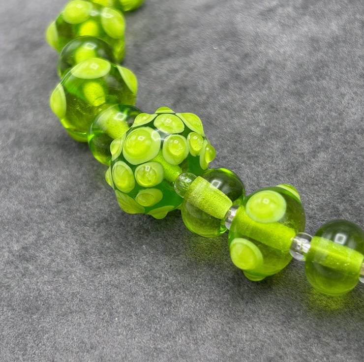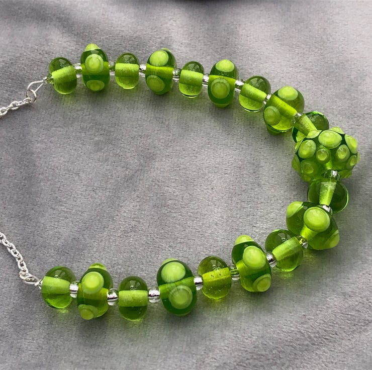 This is a striking bright green lampwork glass beaded necklace and earring set, made using 21 of my own handmade glass beads with bumps and spots of glass on the accent beads. The set really is eye catching and will draw comments from all that see it!