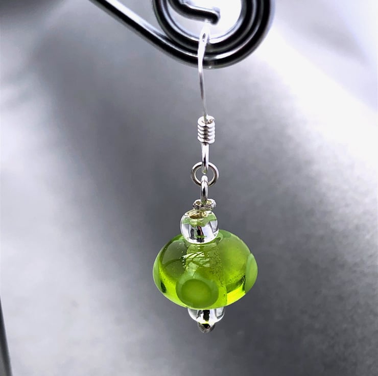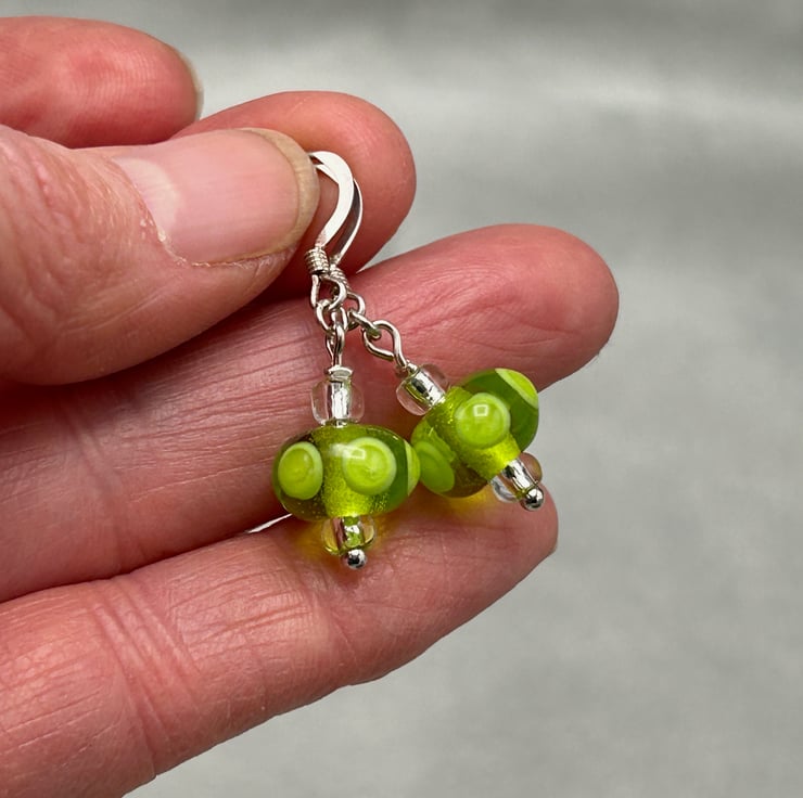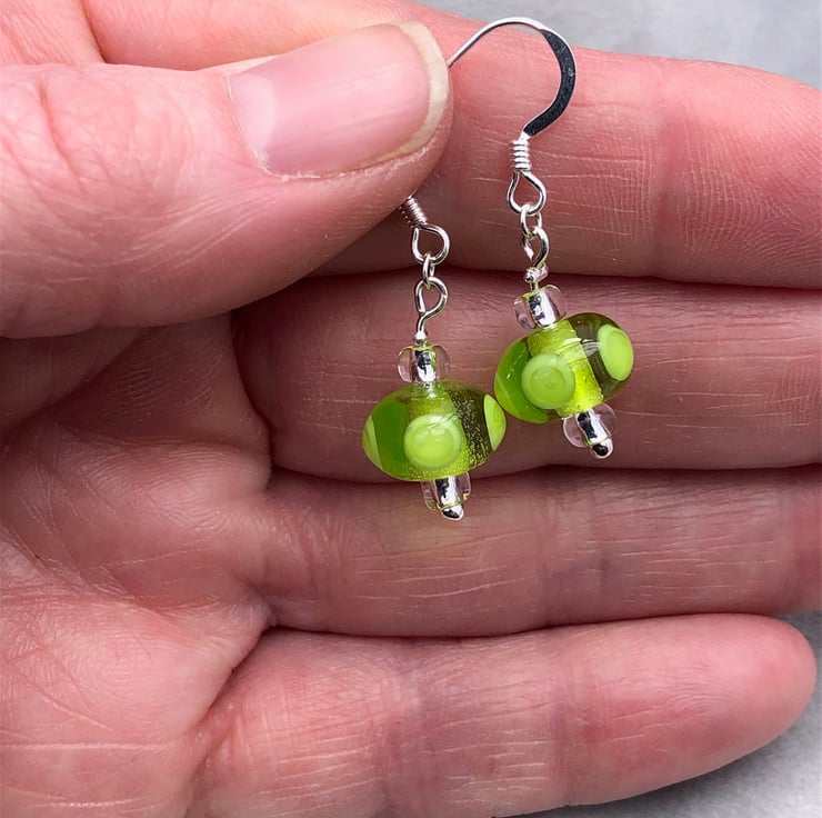 The earrings each have a smaller spotty bead, sterling silver ear wires and a drop of approximately 1 14"