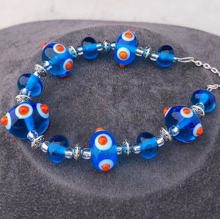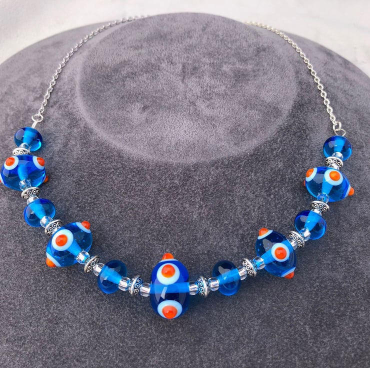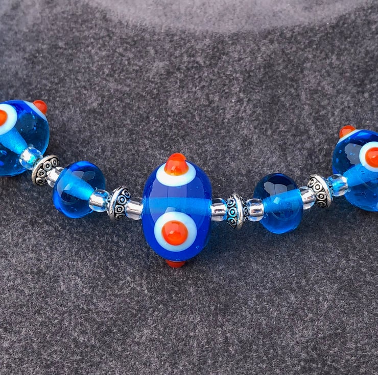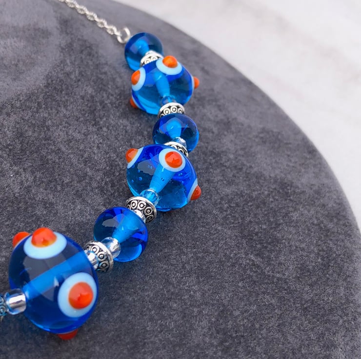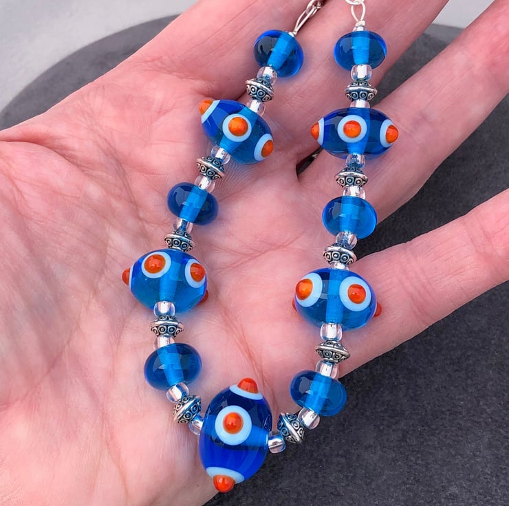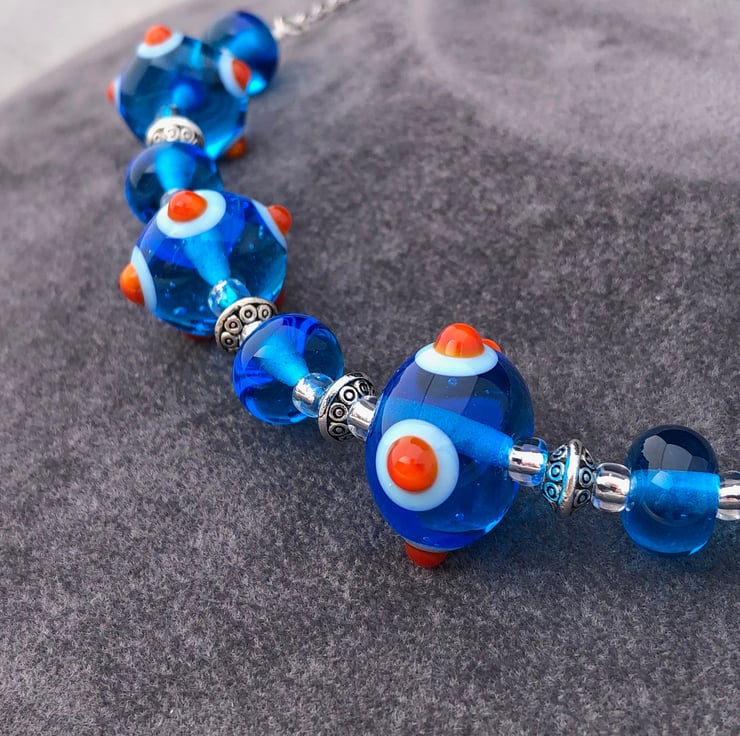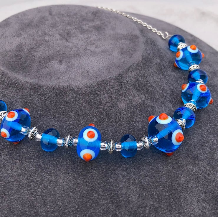 In creating this vibrant turquoise blue and orange spotty bumpy necklace I used 11 of my handmade lampwork glass beads, combining them with Tibetan silver patterned discs and silver lined seed beads.