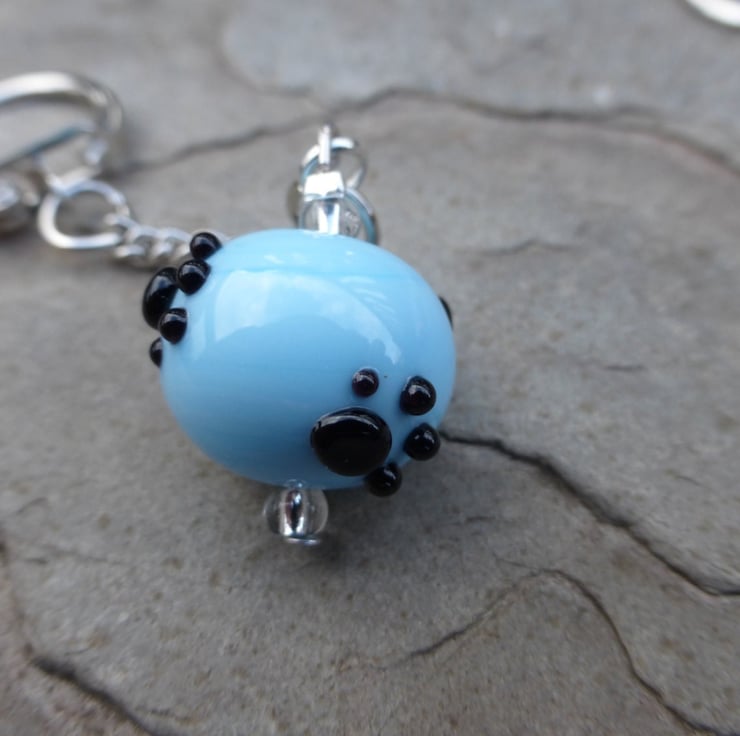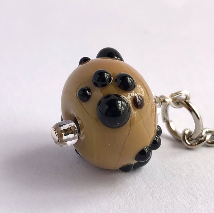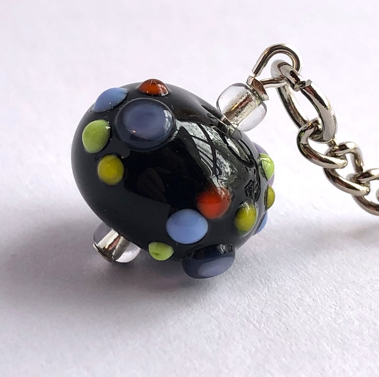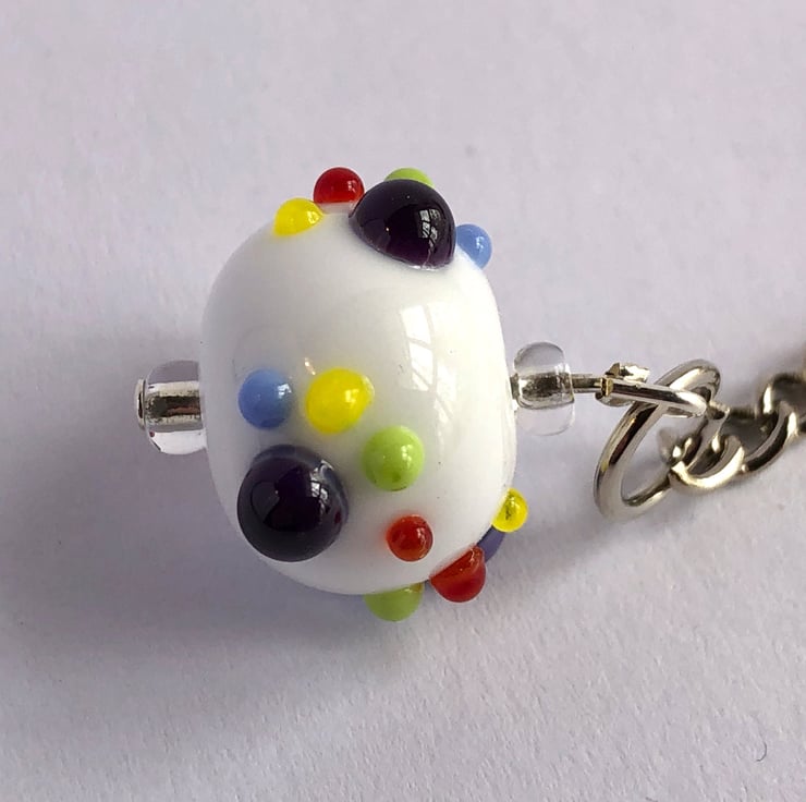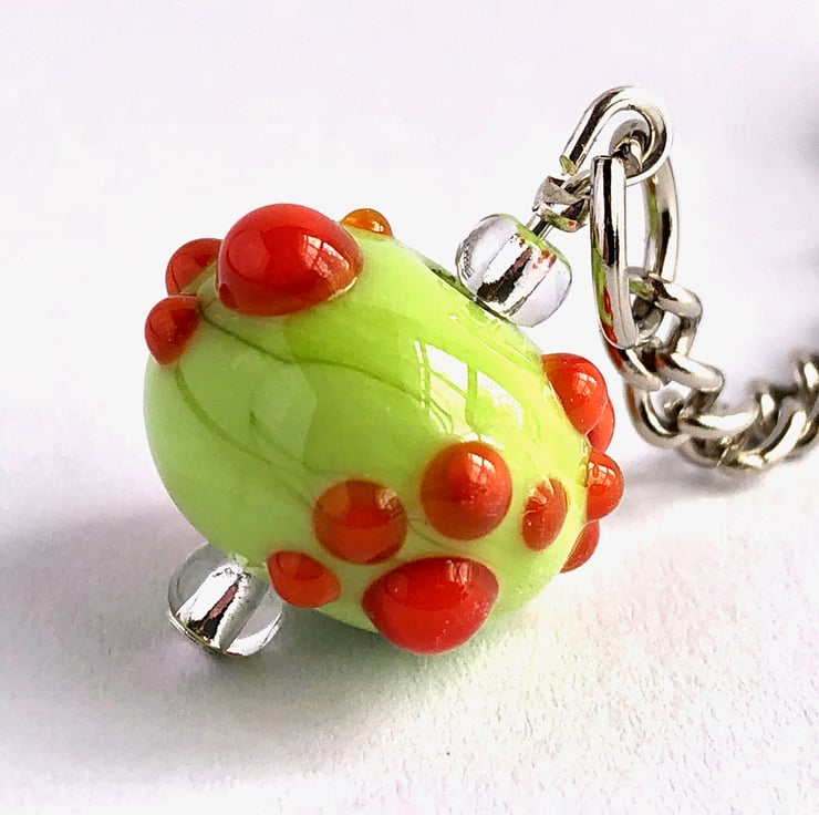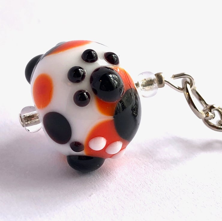 These glass beaded keyrings have been handmade using my own kiln annealed lampwork glass beads with four raised pretty paw prints as a surface decoration hung on a nickel plated keychain. Although the beads are glass, they do survive pretty well with day to day use but will eventually chip leaving a sharp edge, and being glass may not withstand dropping onto hard surfaces eg concrete.