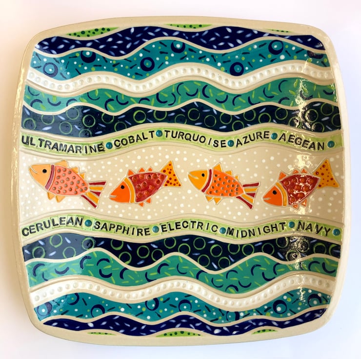 My stoneware ceramic dish is created in my garden studio using a fine quality Scarva clay. Once the clay is leather hard I carve patterns into it and then biscuit fire the dish. Finally I decorate the dish with coloured underglazes topped off with a clear shiny glaze and fire it in the kiln for 10 hours!