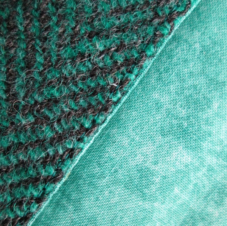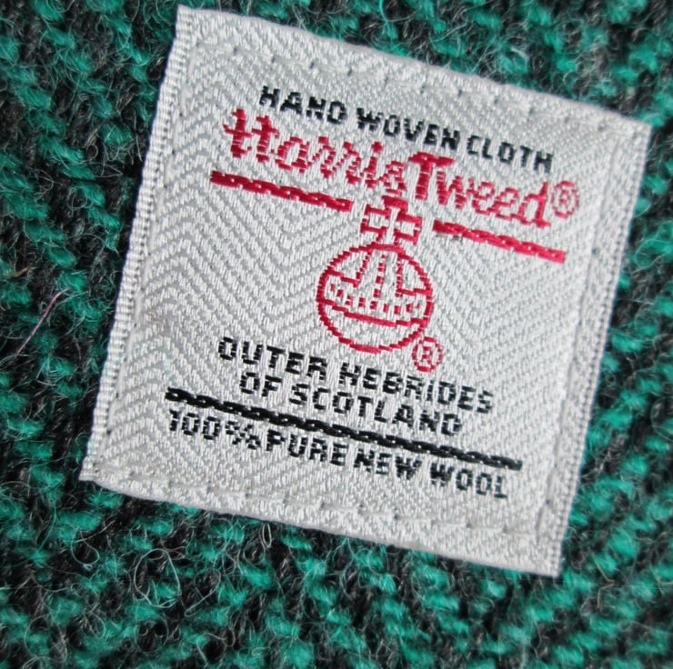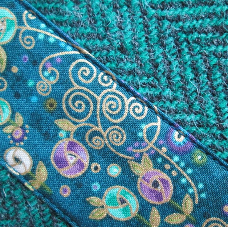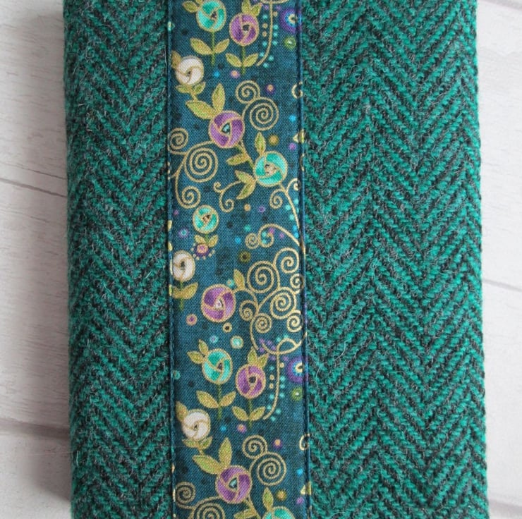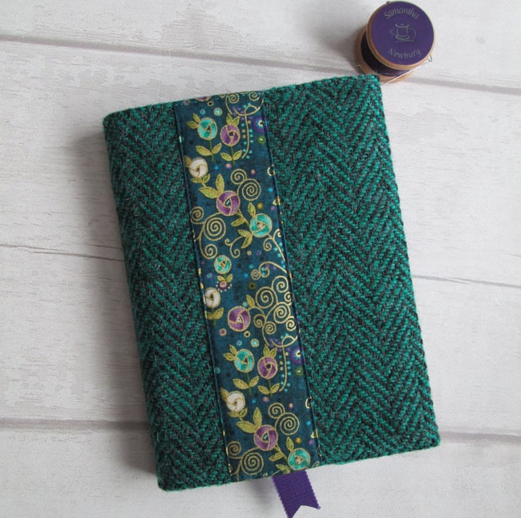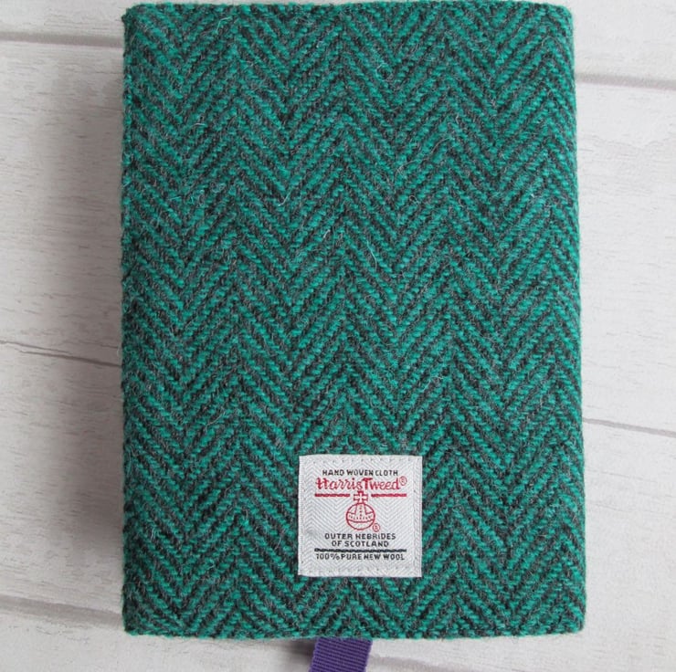 A very smart 'Harris Tweed' notebook cover in a gorgeous jade green and charcoal grey herringbone, handwoven by A Harris Tweed Weaver on the Isle of Lewis. A delve into my 'special snippets' box produced a little piece of an lovely Mackintosh style print in coordinating colours to grace the front of the notebook. I've used a turquoise marble print for the lining and incorporated a purple ribbon place marker. The authenticity of the 'Harris Tweed' is guaranteed by the 'Orb Mark' label on the back of the notebook.