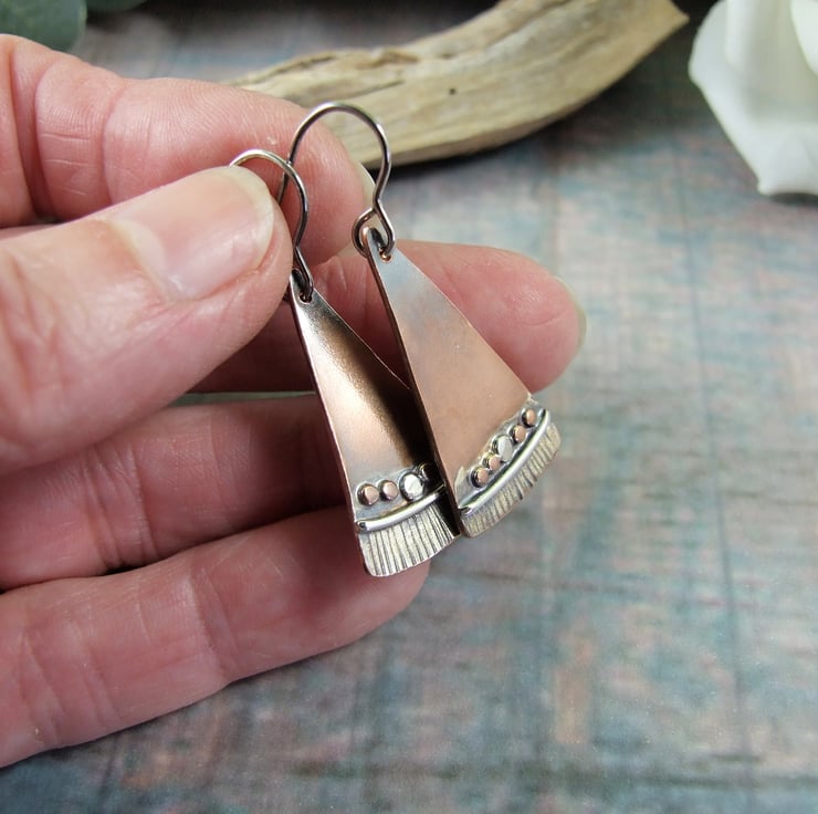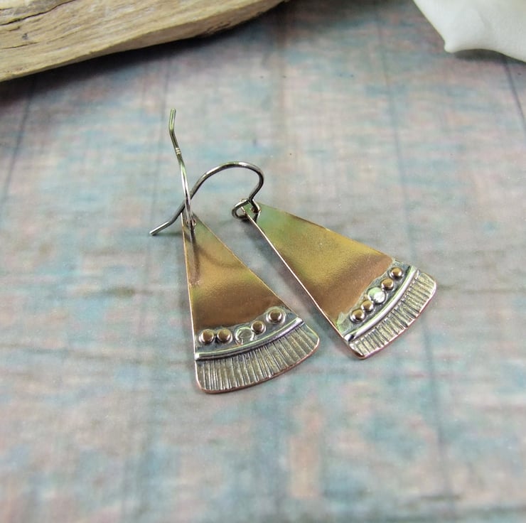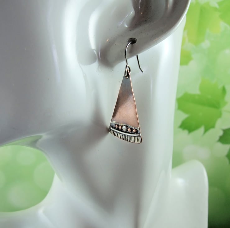 I have created the fan shapes from copper sheet, hand cut and textured with a hammer, I then soldered on some tiny copper and silver beads and silver wire to decorate. Fitted to sterling silver ear hooks