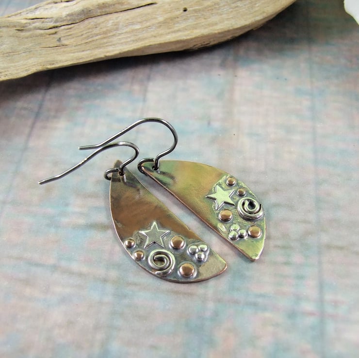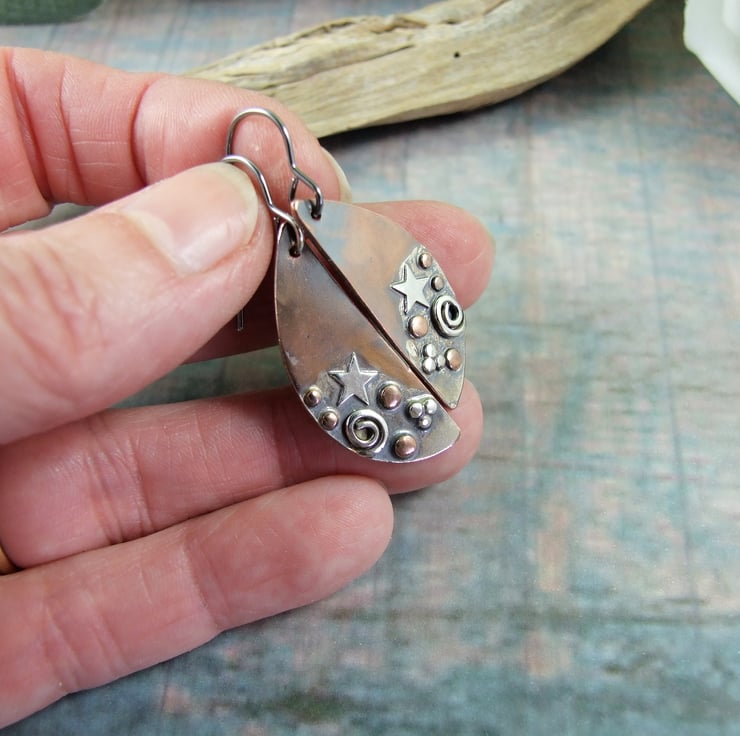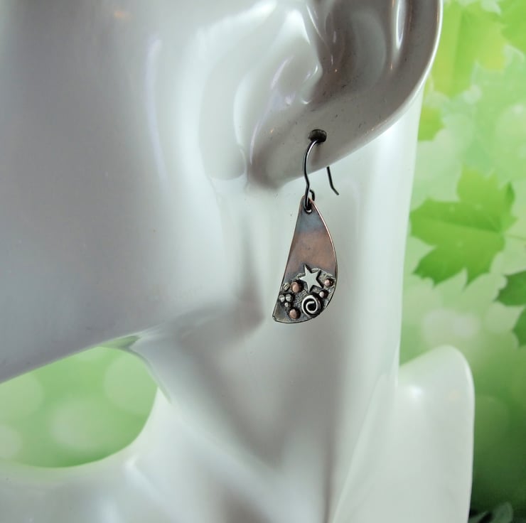 I have created the moon shapes from copper sheet, hand cut and textured with a hammer, I then soldered on a silver star and a galaxy made from silver sire alongside some tiny copper and silver beads to decorate. Fitted to sterling silver ear hooks