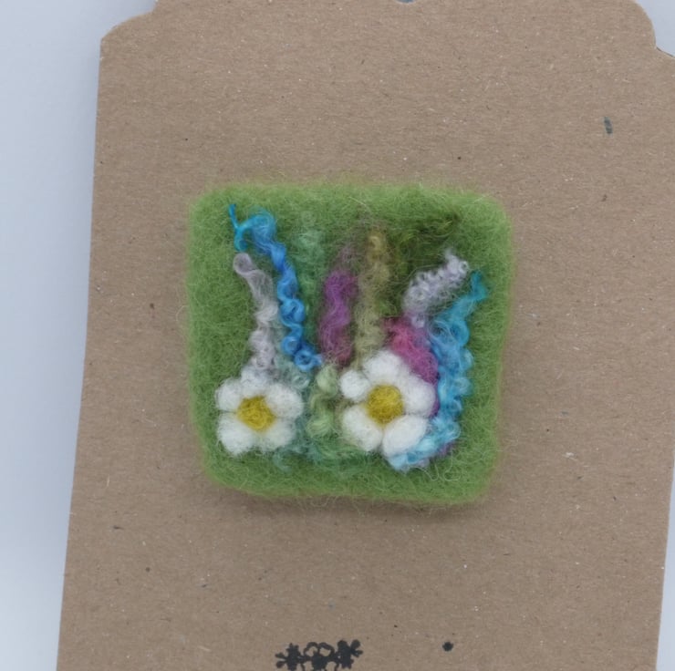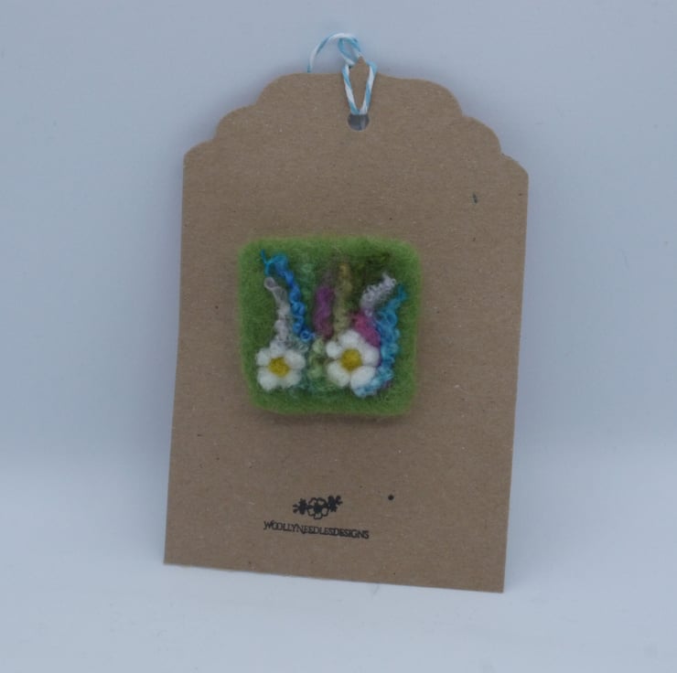 Handmade needle felted square shaped brooch in green with a floral design. The brooch has a metal badge back and will come on one of our tags, packaged in tissue paper.