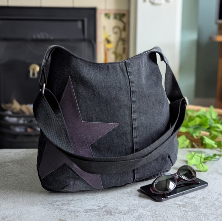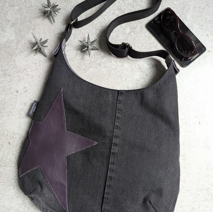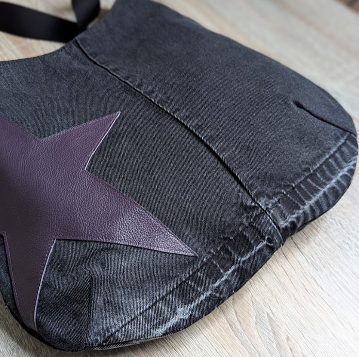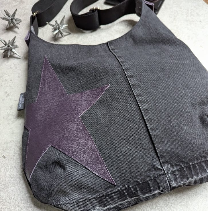 A dark purple leather star motif gives this upcycled denim cross body bag a subtle but stylish twist.