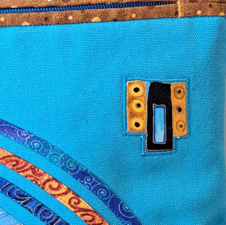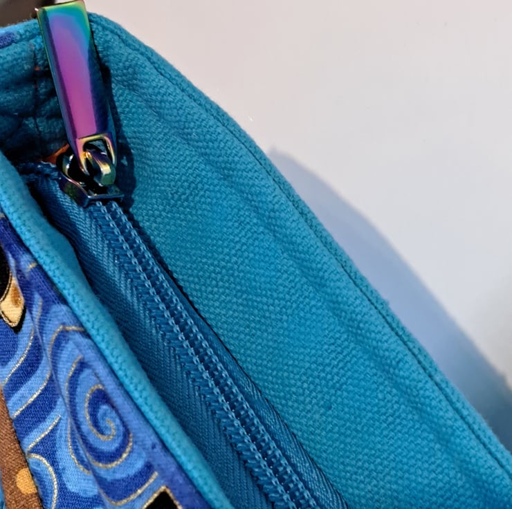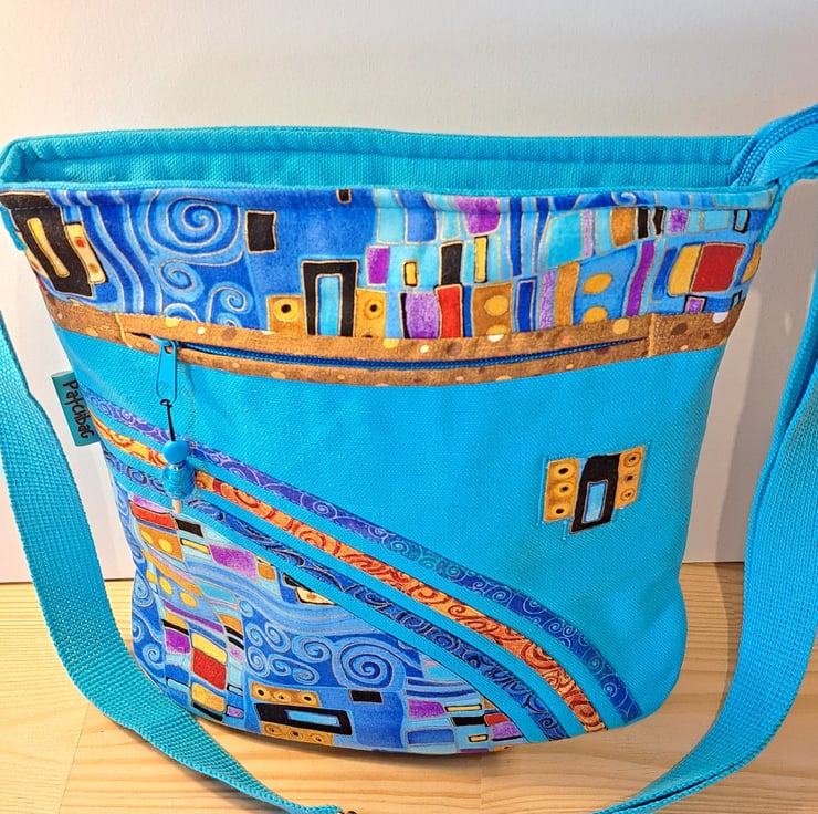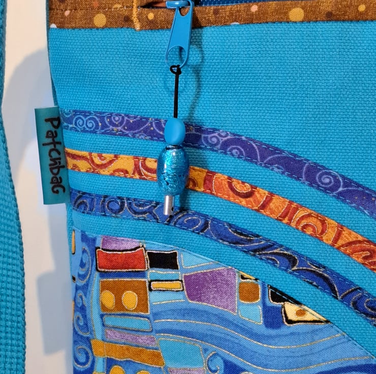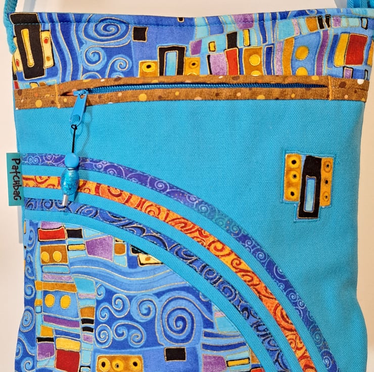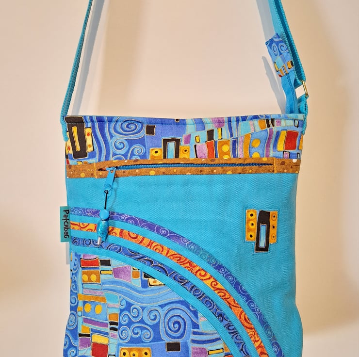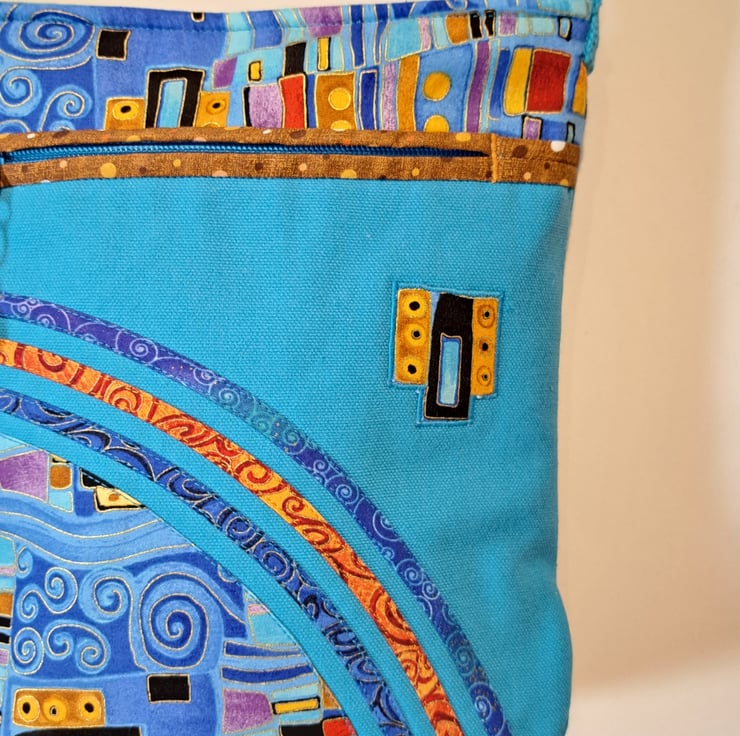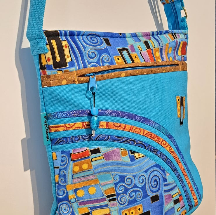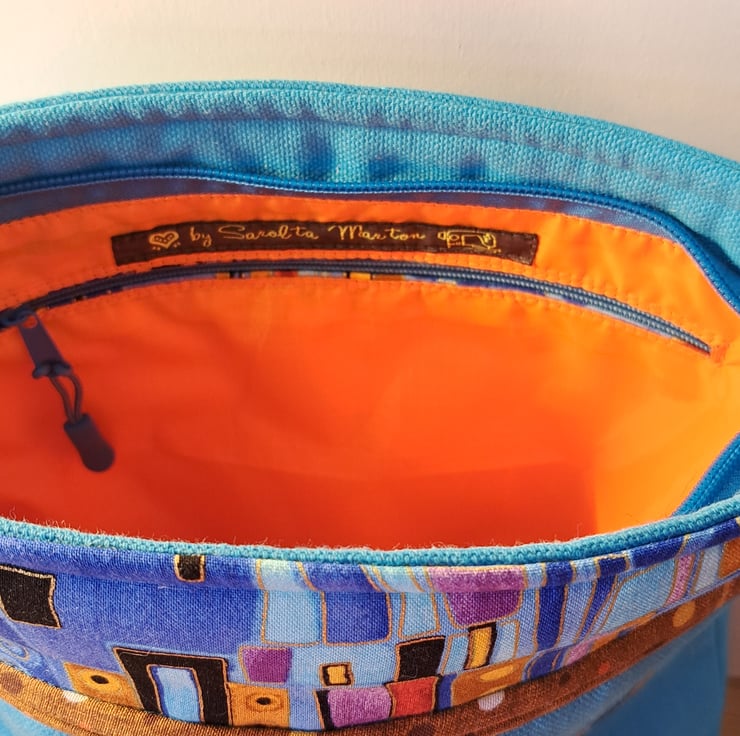 Handcrafted patchwork and quilted sky blue handbag with applique detail. The beautiful pattern reminds me the Gaudi's mosaics in Spain. The main fabric is canvas decorated with cotton fabrics. The main colors are different shades of blue, orange, ochre and a little lilac. The lining made from bright orange waterproof fabric. The bag has inner and outside pockets, both closing with zip. On the outside zip has glass bead charm. The shoulder strap is adjustable with golden metal clasps. Dimenions of the handbag: hight 24cm, width 25cm and deept 8.5cm on the bottom of the bag.