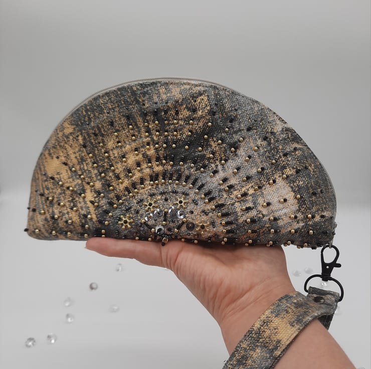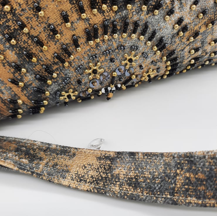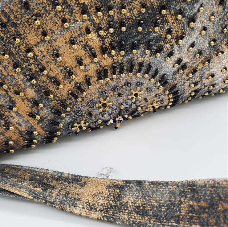 Hand beaded in a semi-circle, half moon shape. I've used a variety of gold, black and gun metal seed beads. Silver sequins and twisted long black beads.