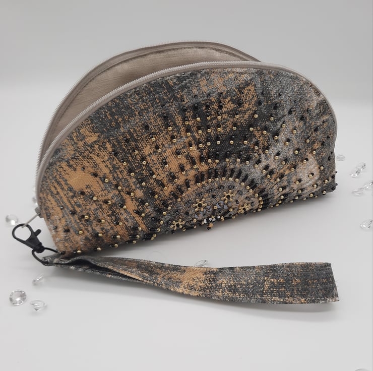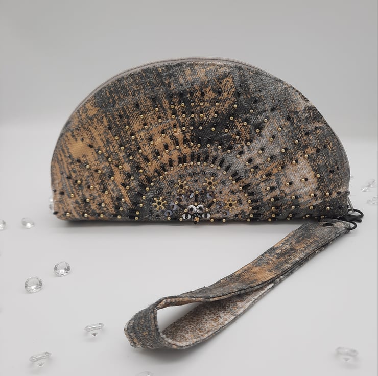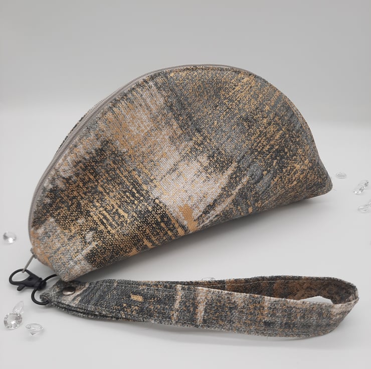 The bag has a zip fastening with a wristlet handle clip on.