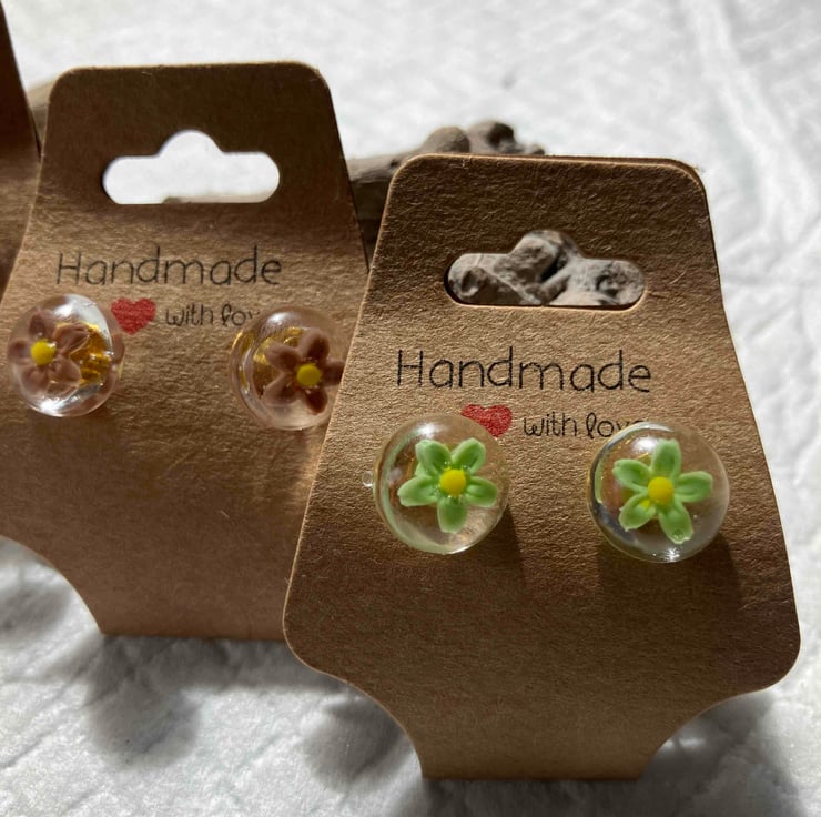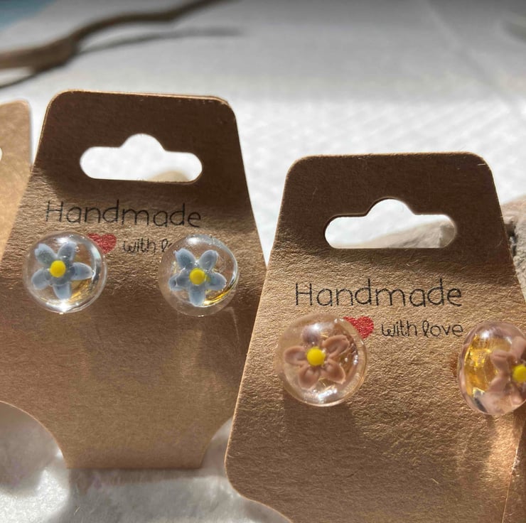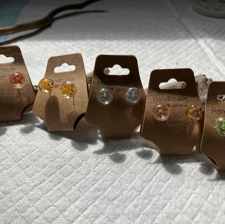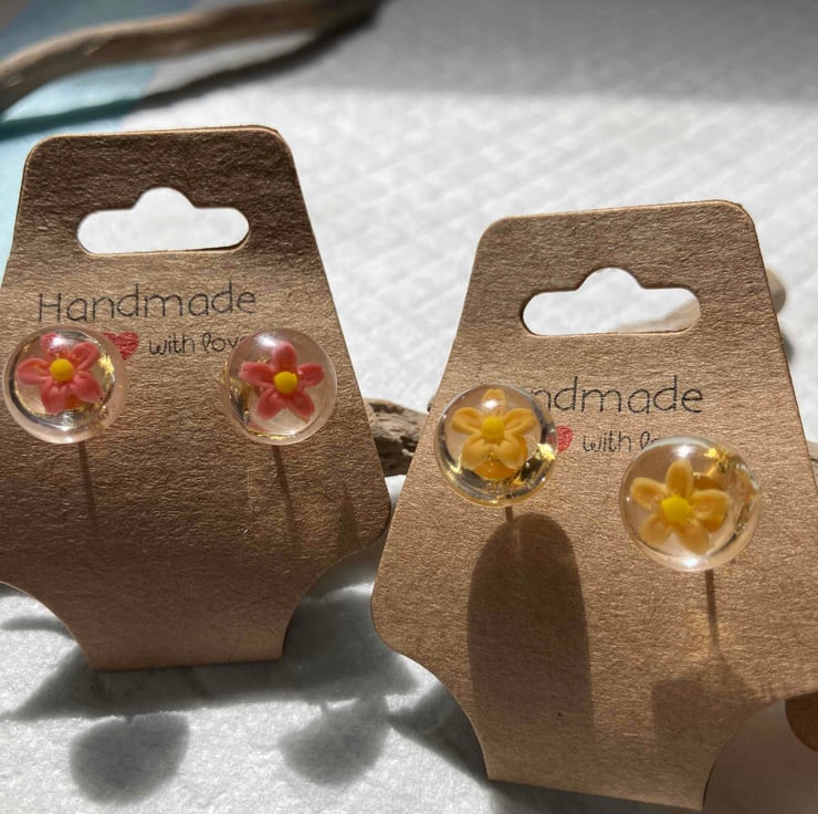 Handmade resin stud earrings with small coloured flower. 12mm diameter with 10mm gold coloured hypoallergenic stainless steel backs. Please specify colour when ordering