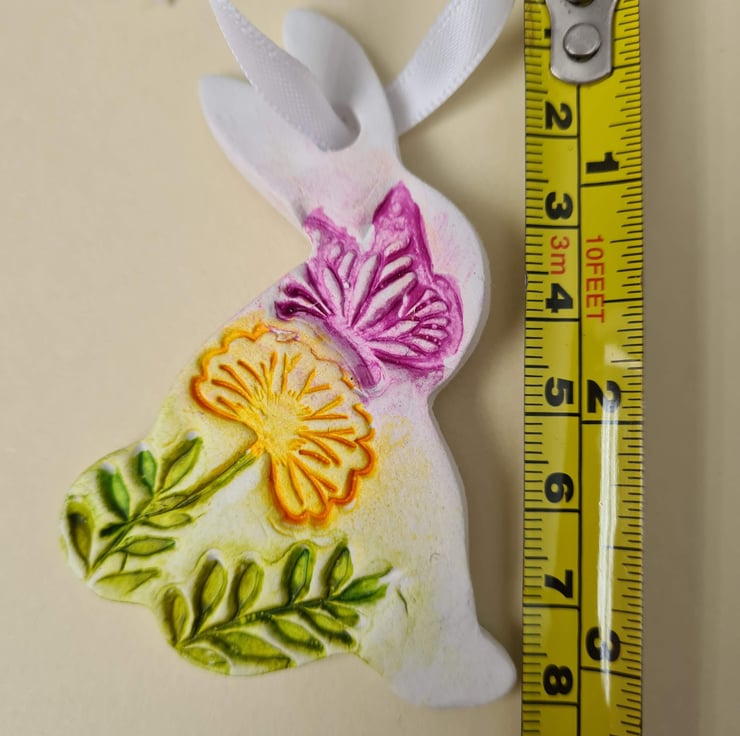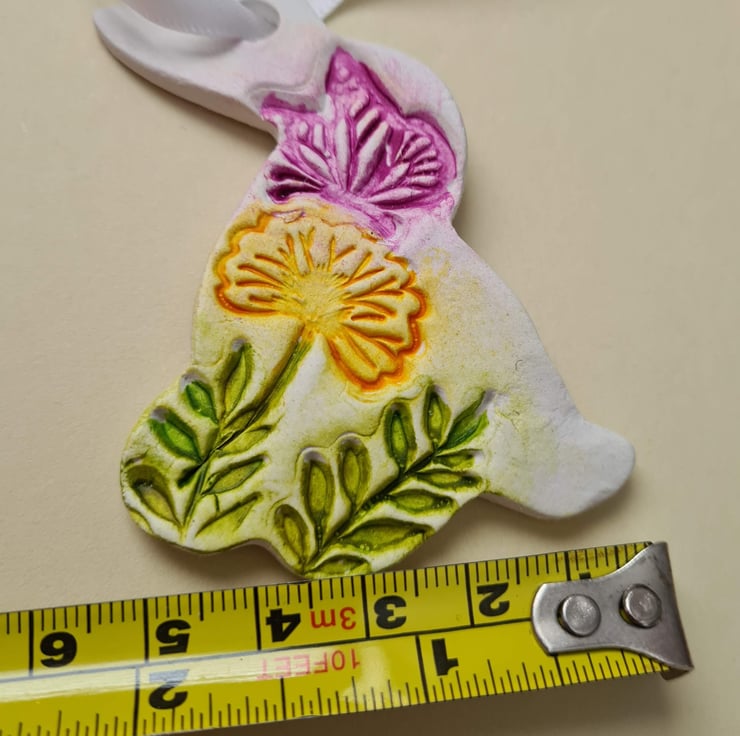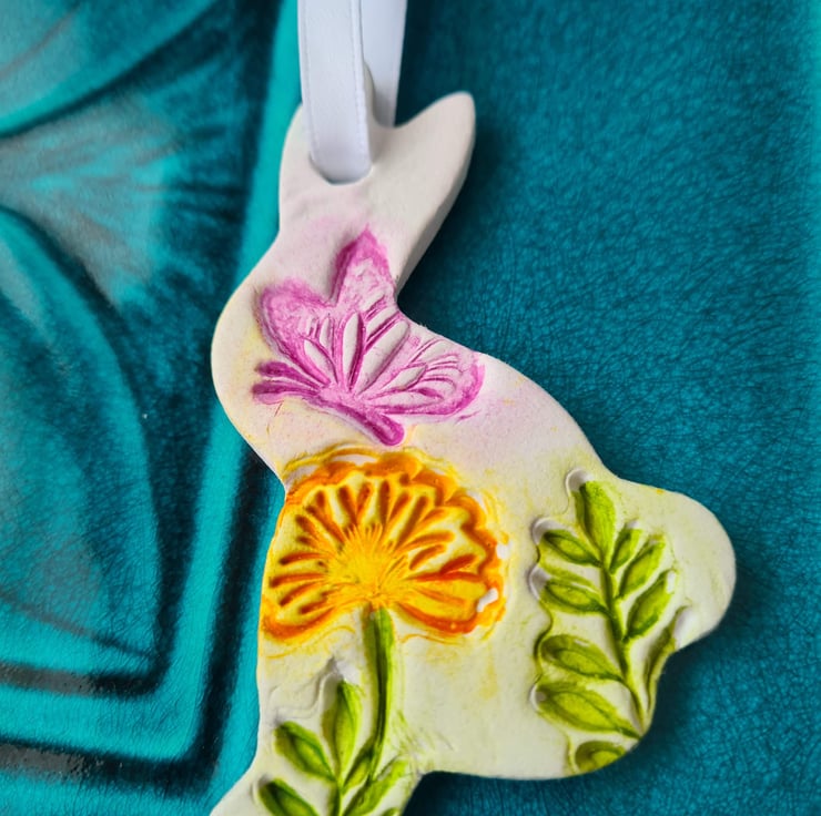 This pretty bunny shaped hanging decoration is made from air-drying clay, which has been embossed with a woodland design including a pretty butterfly. I have painted the design with a colourwash, and varnished the decoration before finishing with a satin ribbon. Also available as part of my 'pick and mix' selection if you'd like to purchase more decorations. See 'Easter' or 'clay creations' collection for more details.