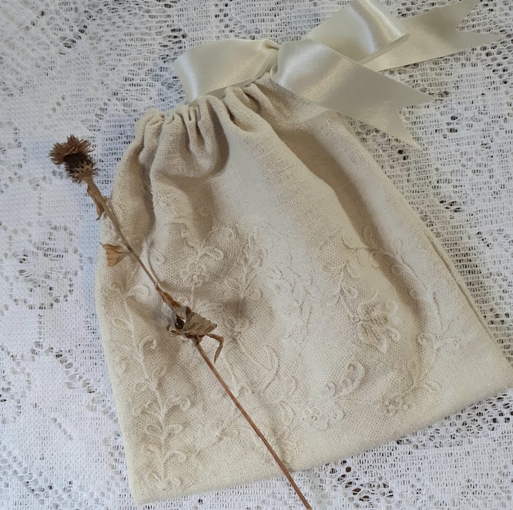 Beautiful soft textile which I believe to be a silk and linen mix. Drawstring bag measuring 8" square. I have added pieces of antique lace and tiny pearls. Finished with silk ribbon.