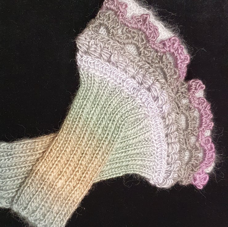 A combination of knitting and crochet makes these wristlets both unusual and striking.