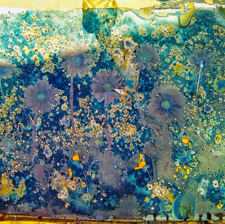 I used salt in the wet cyanotype process, because this creates a wonderful crystalising effect, as well as a spritz of vinegar, to lighten the shade of blue in the final print.