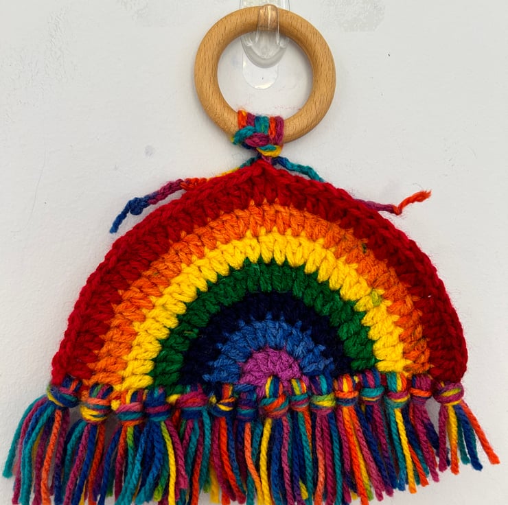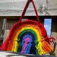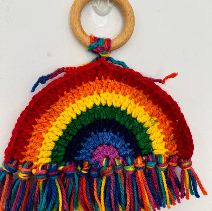Unique, one off hand crocheted rainbow wall decoration with multi coloured tassels and wooden ring.