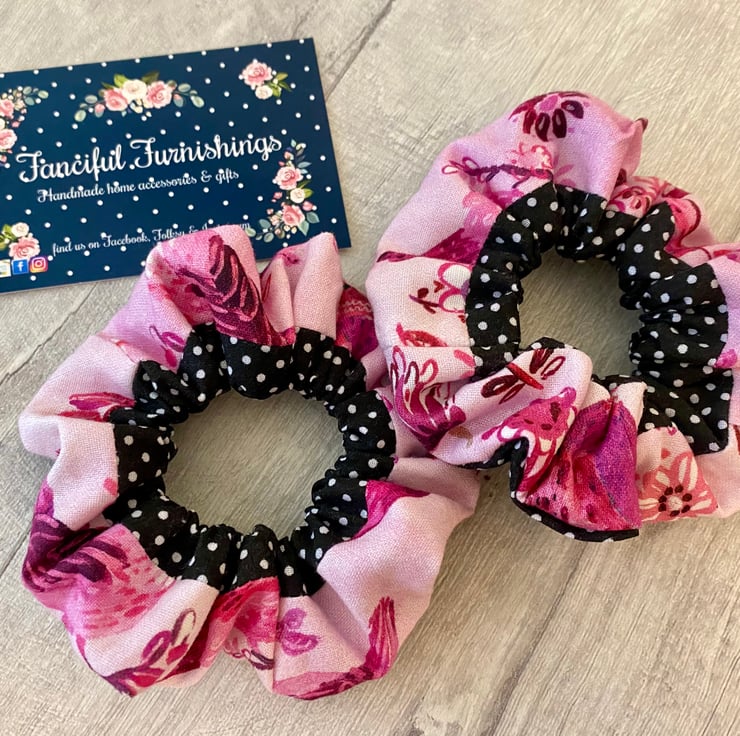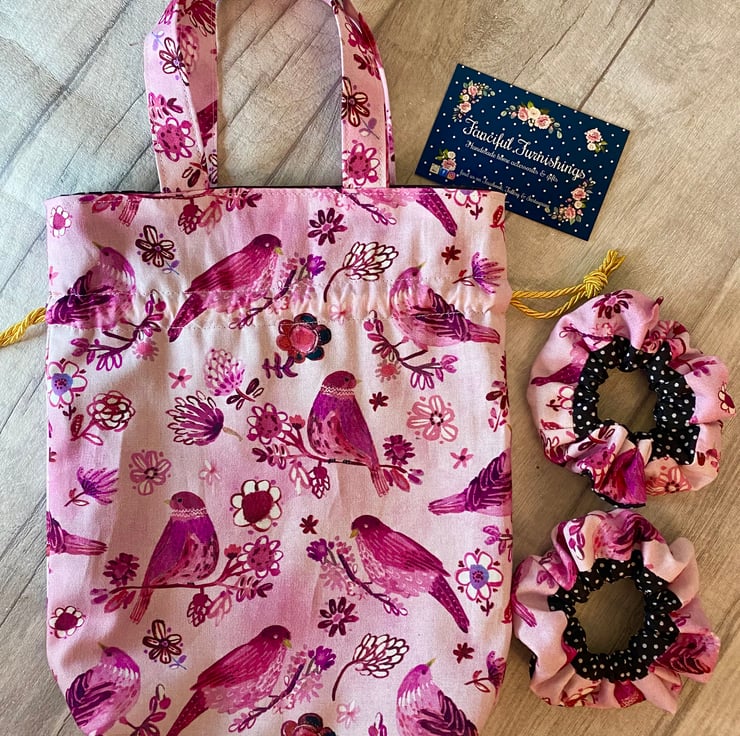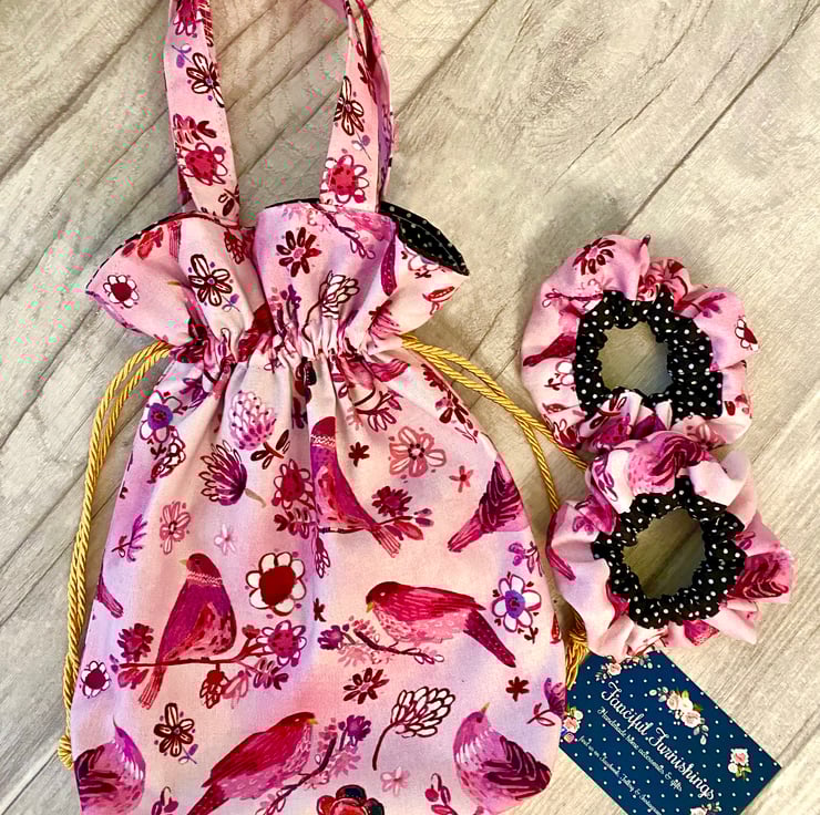 Beautiful girls dolly style bag with two matching scrunchies. The bag measures approximately 10 x 8” (excluding the handles), it’s fully lined and finished with a gold coloured tie cord which works sets off the print on the fabric. This would make a beautiful gift for a young lady. I have lots of other beautiful fabrics available on request.