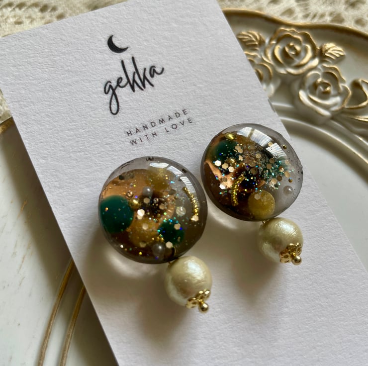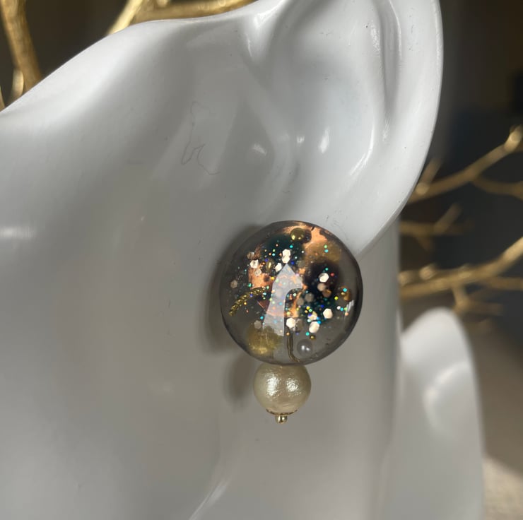 Gaze into these unique resin-based earrings with cotton pearls beads.