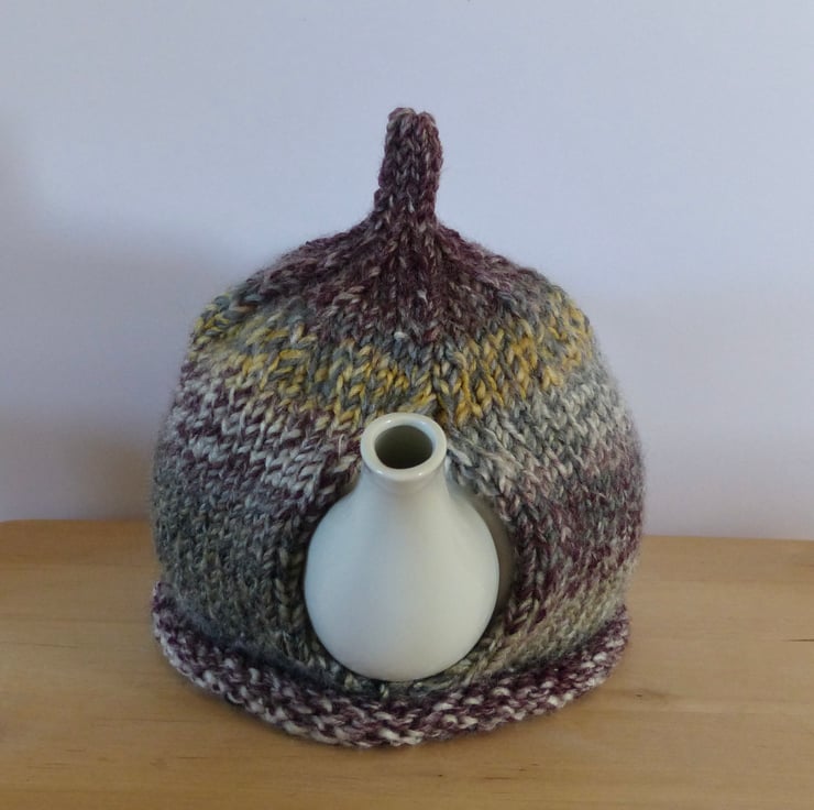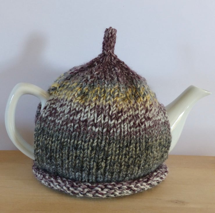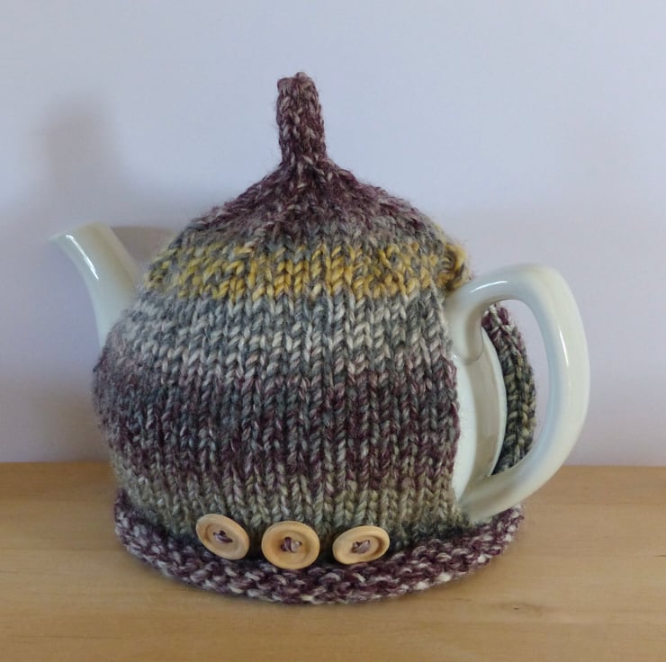 A hand knitted Tea Cosy in a chunky variegated yarn in shades of Grey, Aubergine, Beige and Straw. It has a 'pixie' top and three natural wood buttons on the front for decoration.