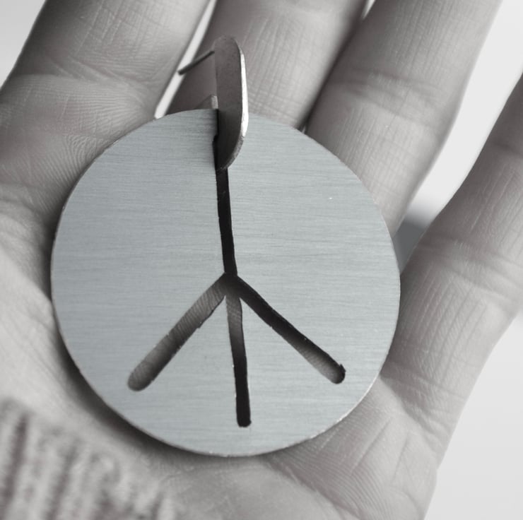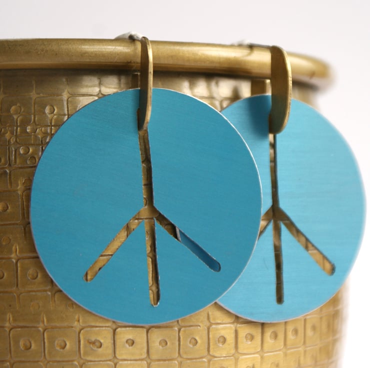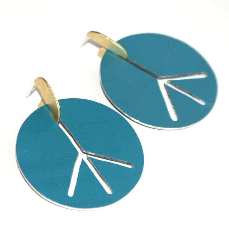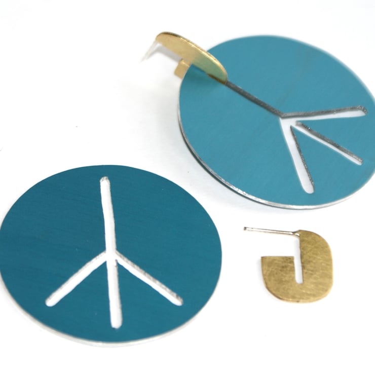 The perfect festival earring or for someone who loves large colourful hoops, these peace sign earrings are hand cut in 2 parts using my jewellers saw. The large coloured part is made from anodised aluminium which has been hand dyed. The stud part is made from brass with a sterling silver ear post and has been given a mat satin finish. the 2 parts fit together with a narrow slot.