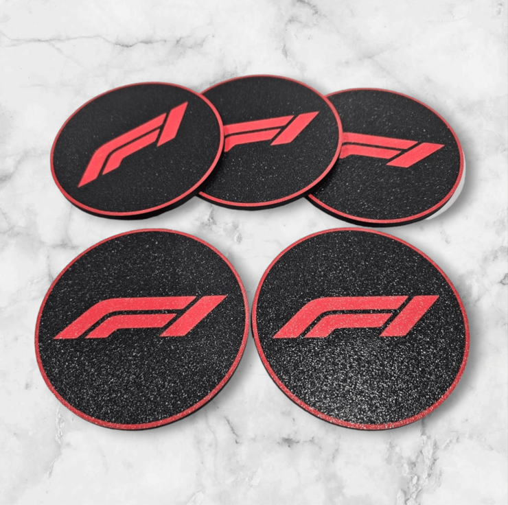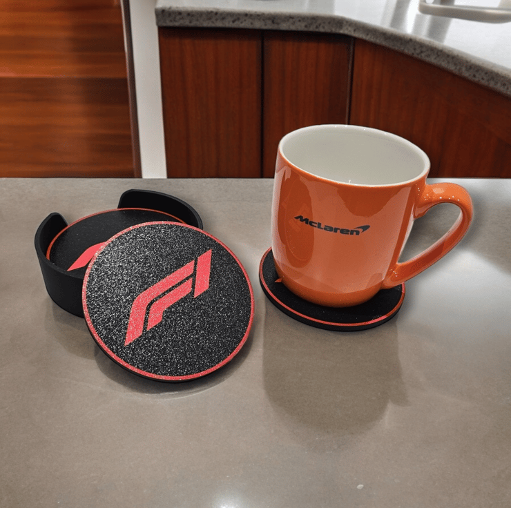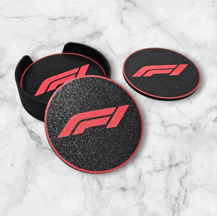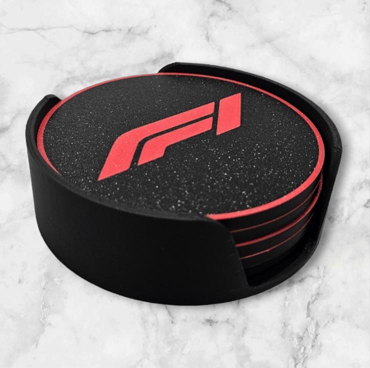 These Sleek and stylish 3D printed F1 Logo Coasters great addition to your coffee table, a smooth matte look with a textured finish. A must have for any F1 fan! Each pack will contain 5 coasters and a holder to store the coasters when not in use.