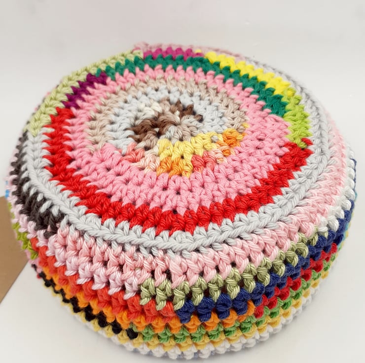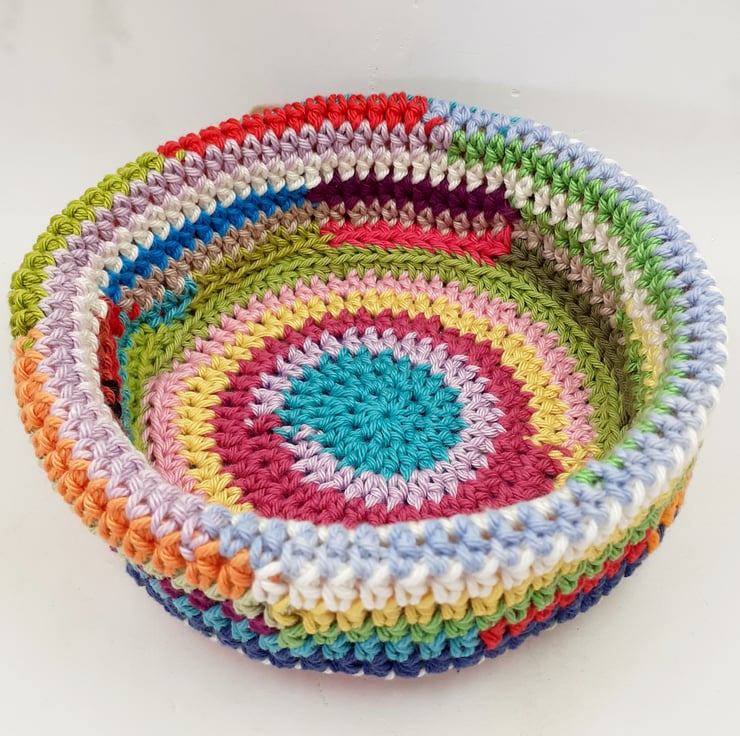 This useful little bowl is crocheted from my leftover scraps of cotton.it is a double layered pot lined with stiffened craft felt for added stability. It is perfect for storing miscellaneous items in a home office or for keys coins etc on a hall table. Its internal measurements are approximately 13 cm in diameter and 4 cm in height. The tag reads, Made from Odds & Ends for your Odds & Ends.