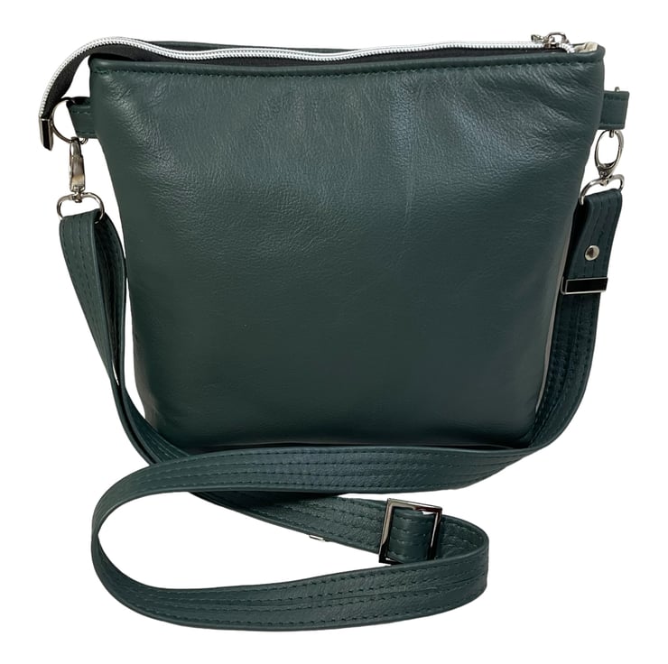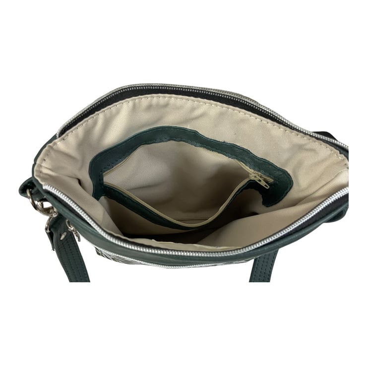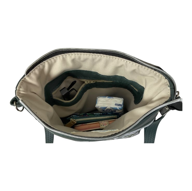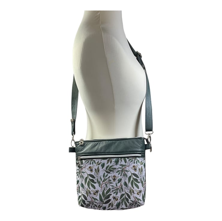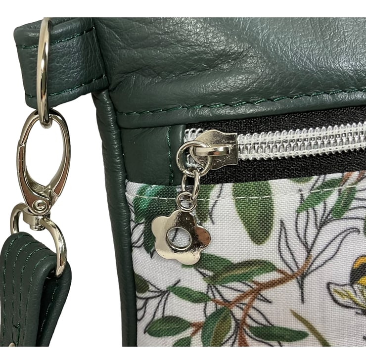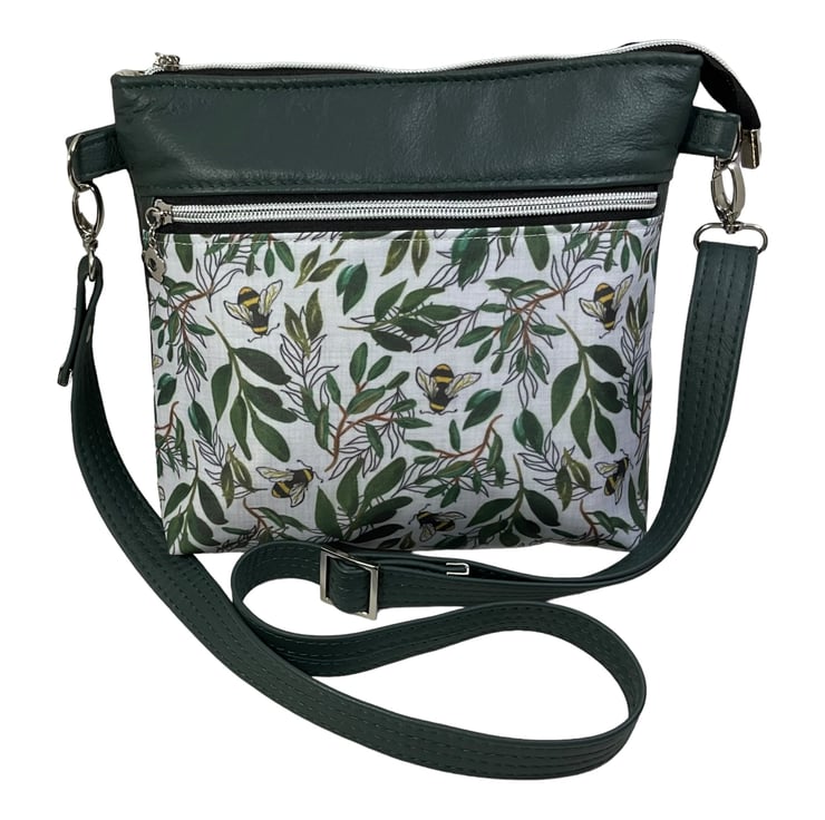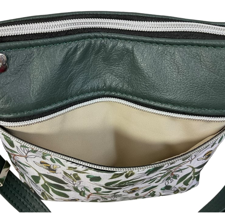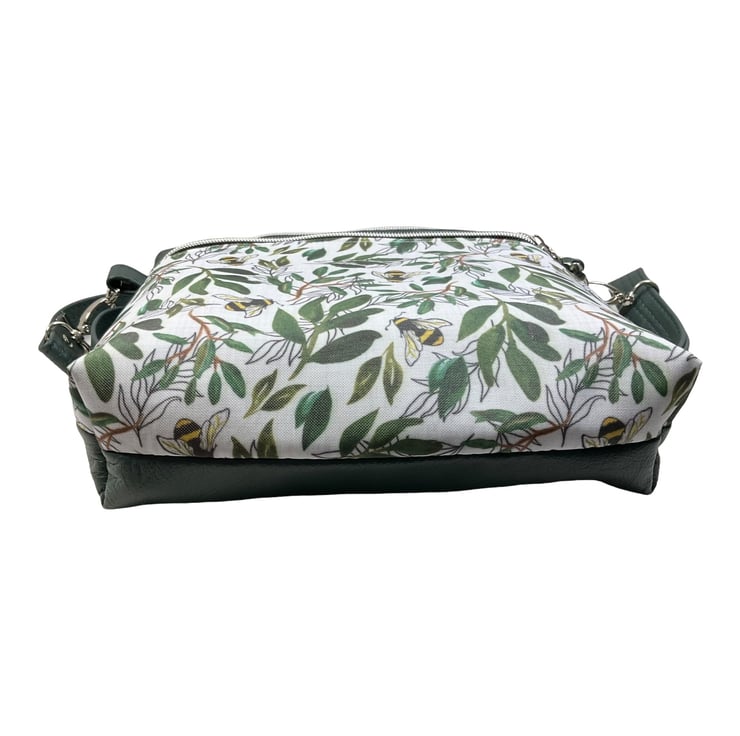 This handy sized bag is made of lovely soft and supple genuine cows leather in a dark green shade. It has been paired with a front pocket made in water resistant canvas that features bees and a pretty floral print.