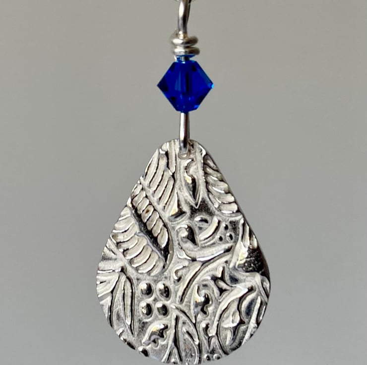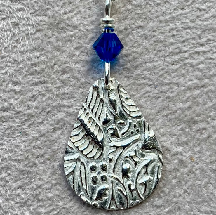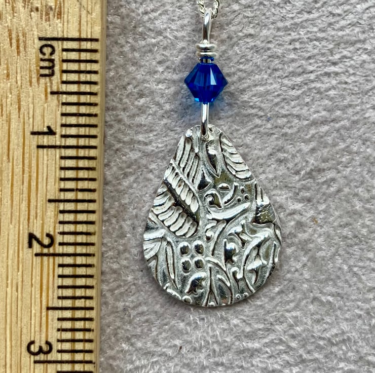 Pure silver teardrop necklace with a blue Swarovski crystal. On an 18” sterling silver chain with an adjuster at 16”.