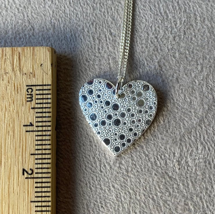 Pretty, pure silver heart with bubbles texture detail. On an 18” chain with an adjuster at 16”.