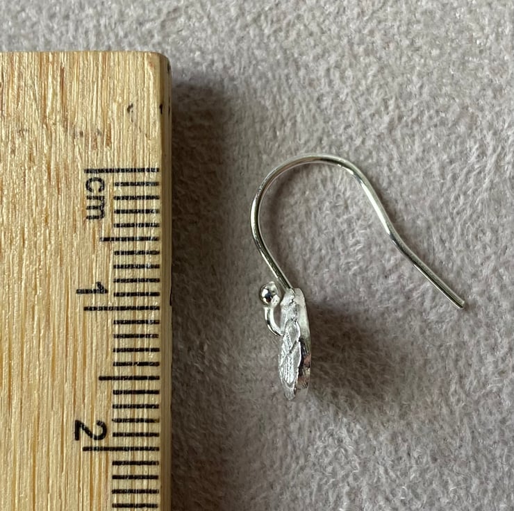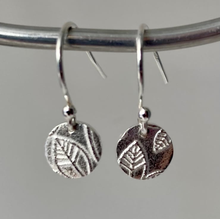 Pure silver circular earrings with leaf detail. On sterling silver ear wires.