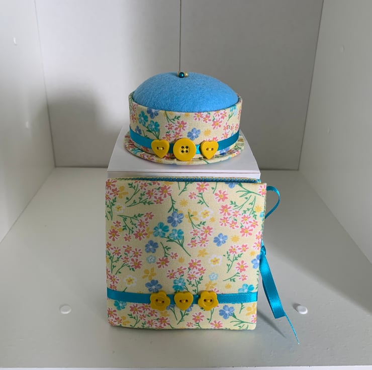 The pincushion has a firm recycled circular cardboard base covered with yellow/turquoise floral cotton. This has a turquoise blue ribbon trim with three yellow heart/round button decorations. The pincushion part is made from turquoise felt stuffed with fibrefill and fixed firmly into the circular cardboard base.