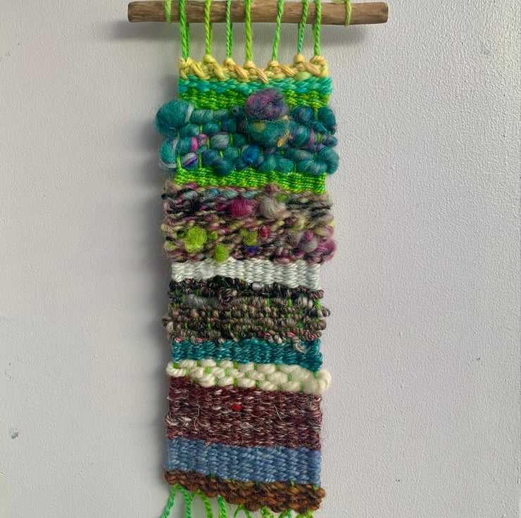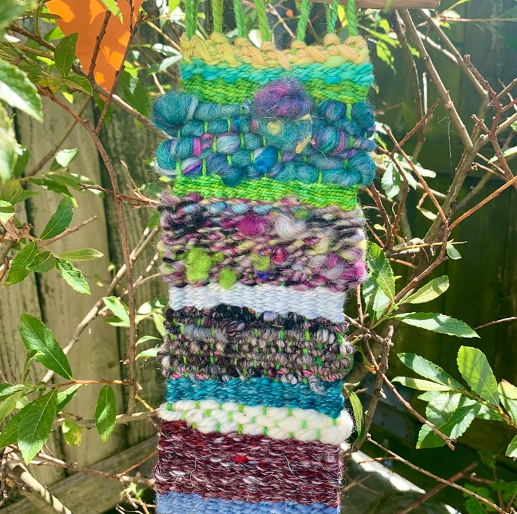 The wooden branches that the weaving hangs upon are found in my local woodland of Dorset. I love using fallen branches and twigs as it gives the art weavings a connection with nature. Bringing a tiny bit of nature into your own home.