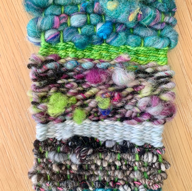 A mini sacred art weaving made with magic and woven with love. Each weaving is woven using hand spun wools using a variety of different fibres: wool, sari silk, wool locks, plant fibres, and a bit of sparkle. These fibres are hand blended and carded into art batts and then spun into art yarn, and then woven into these mini wall decorations.
