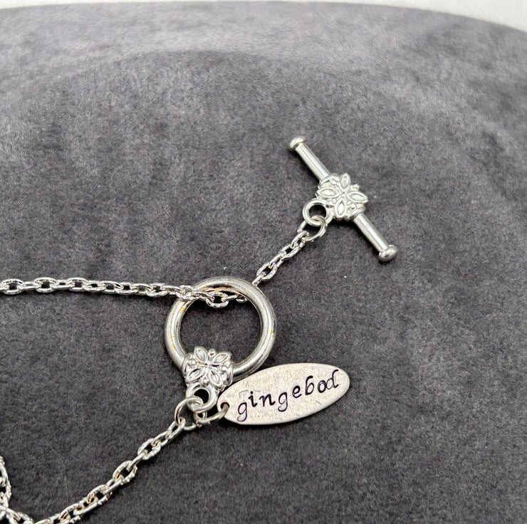 The necklace chain, fancy toggle clasp and 'gingebod' jewellery tag are silver plated, overall the necklace is 21" in length.
