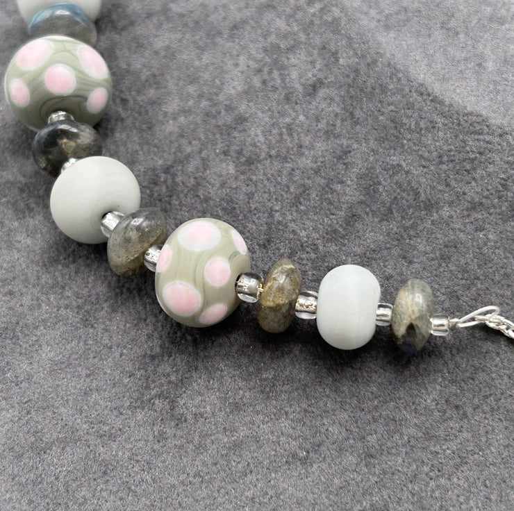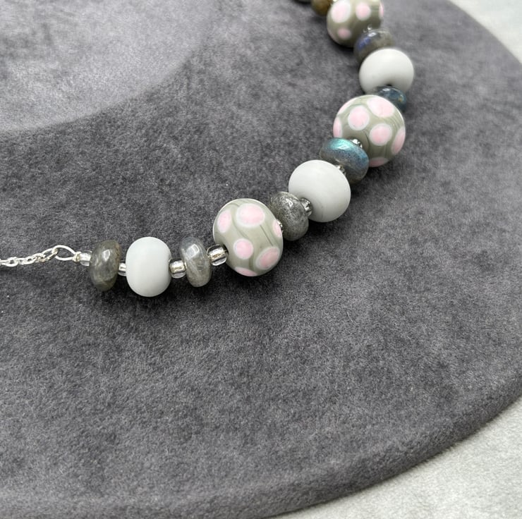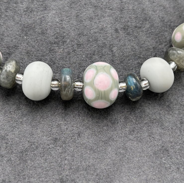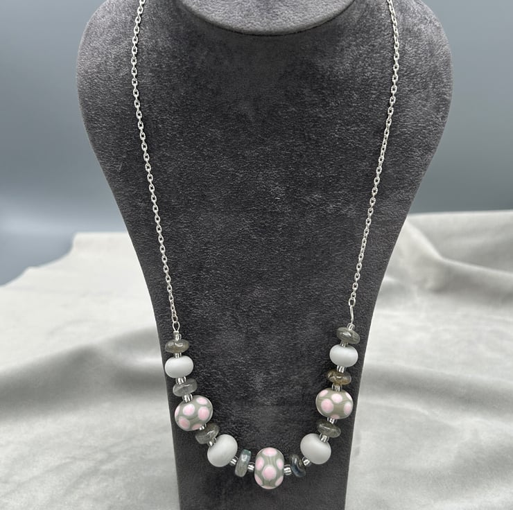 There are 7 of my handmade lampwork glass beads in this grey and pink spotty necklace which have been etched to give a soft velvety look. The spotty beads are around 15mm diameter, and the plain grey beads are 11-13mm in diameter. I have combined these with grey iridescent semi precious stone roundels which shifts colour with flashes of blue depending on the angle of light, and seed beads.