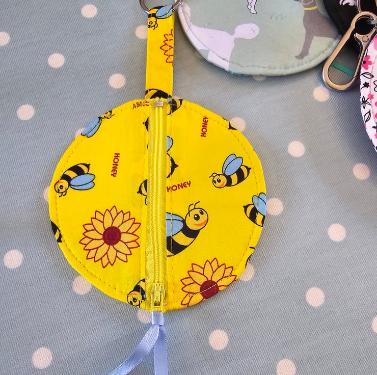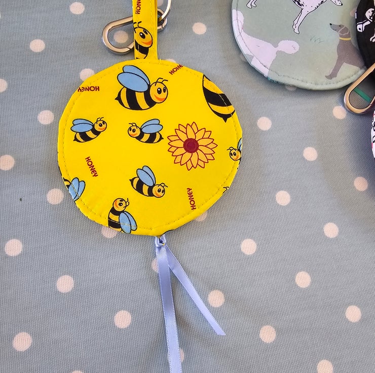 Approximate sizing: Circular pocket is approximate 11cm across - length including pocket, loop & metal keychain is approx 23cm