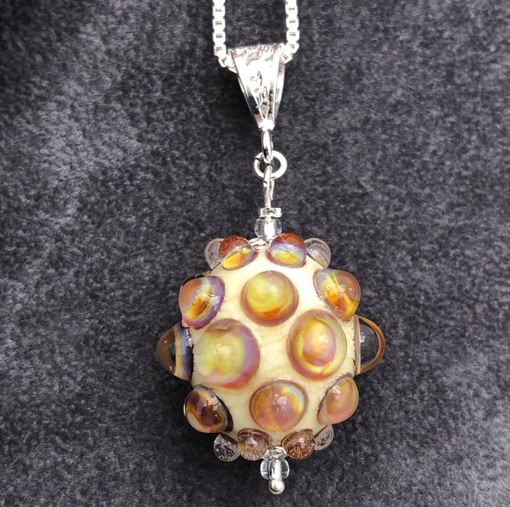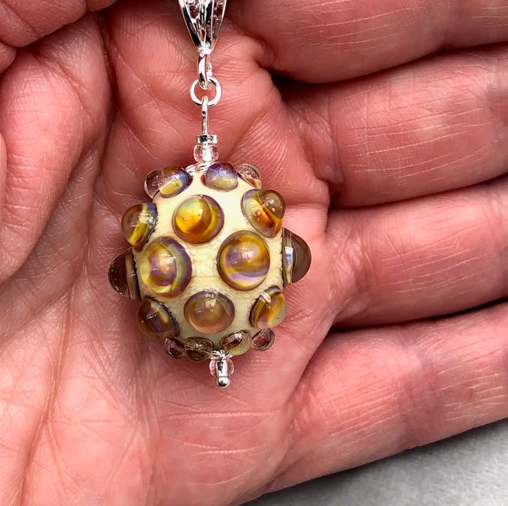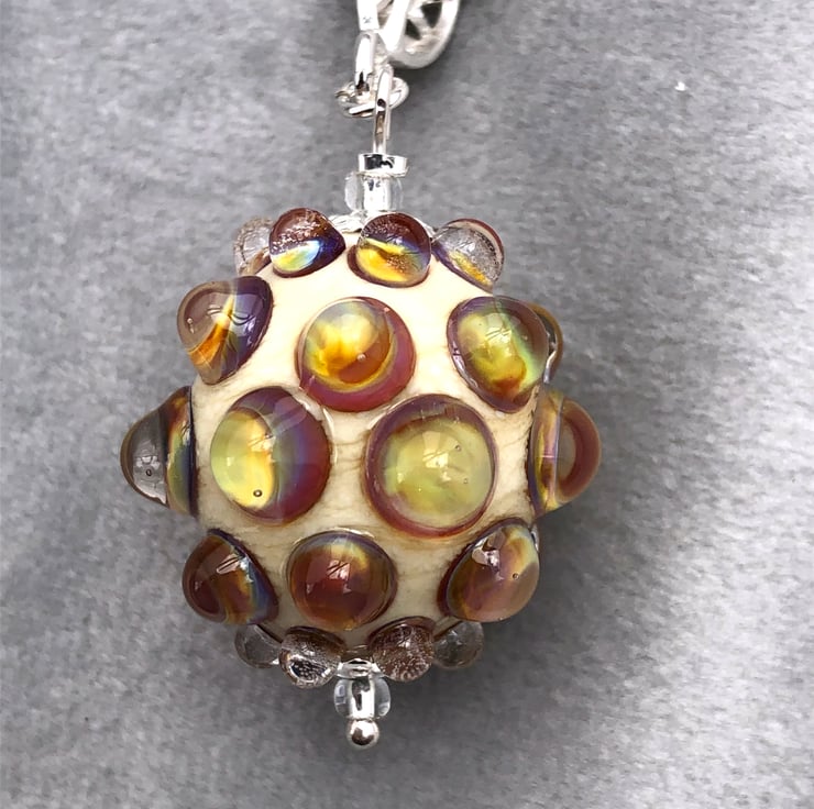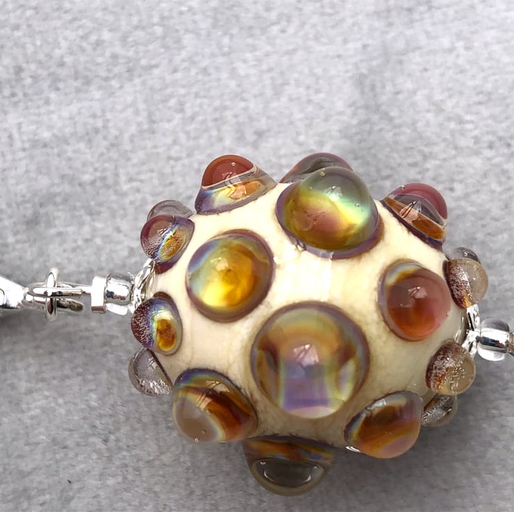 In this case, the spots have reacted to give a warm golden effect, hints of pink, purple and yellow can be seen in swirls underneath the clear bumps of glass that encase the spots. The base bead is made with ivory coloured glass which has then been shaped in a graphite mould to be oval, before the design is carefully applied.