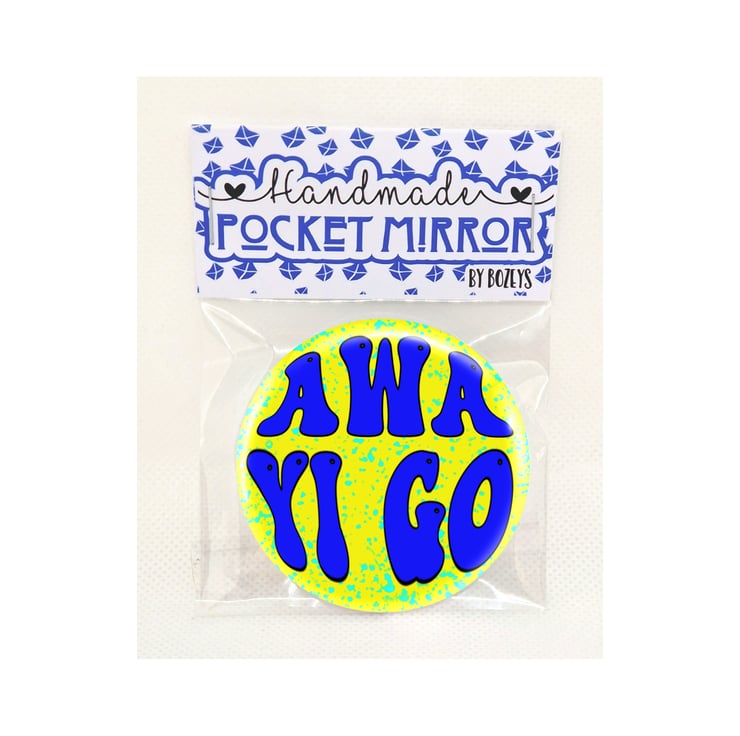 One of my new Button Badge designs, “Awa yi go!” can be made into any or all of the following;