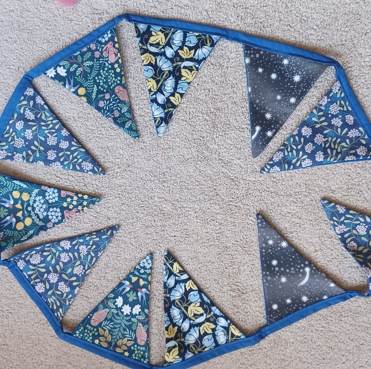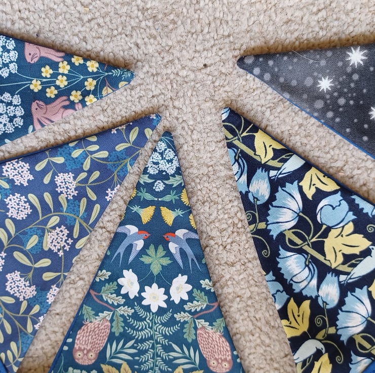 Our bunting is made from Quilter's quality cotton, double sided, with five flags - the odd number is better for symmetrical hanging. No two strings are exactly the same as we've mixed and matched some of our favourite fabrics for different looks.