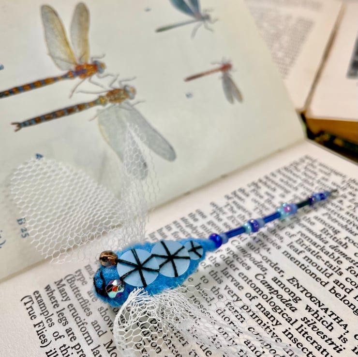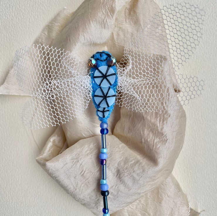 Each brooch is individual and varies from each other due to their unique handcrafted nature. The dragonflies have been embroidered through the use of felt, net , sequins and seed beads. As well as having a hand sewn metal brooch pin at a size of 2.5 cm's at the back.