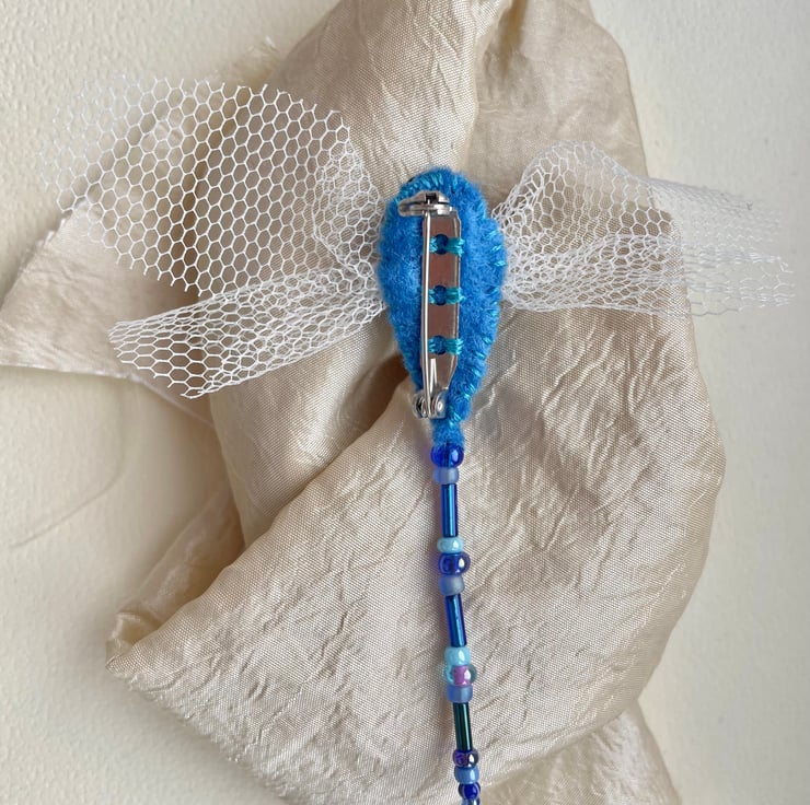 This is a 3 dimensional bespoke hand embroidered blue dragonfly brooch pin. Complete with an under the leaves brooch/gift box.