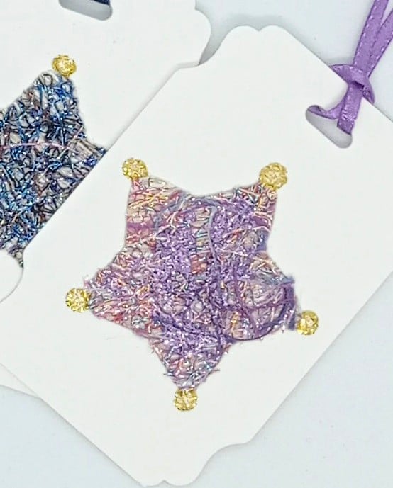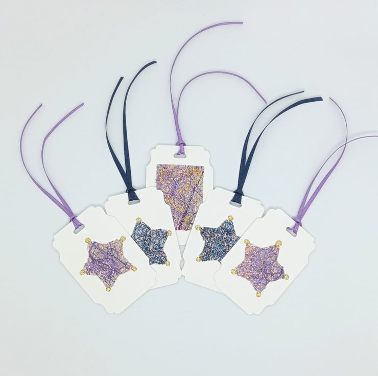 Set of five unique gift tags made from a variety of threads and Bondaweb.