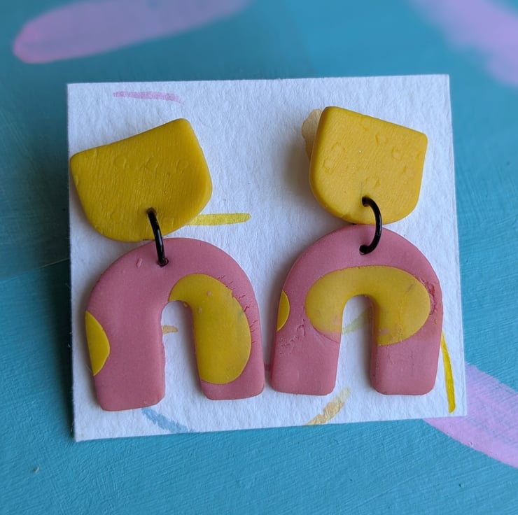 Add a pop of colour and joy to your outfit with these unique and eye-catching pink and yellow earrings. Handcrafted from lightweight Fimo polymer clay material, these earrings feature a delightful, inverted U-shaped design that combines vibrant yellow and pink colours for a look that’s both fun and stylish. Lightweight and comfortable to wear, these earrings will quickly become your go-to accessory for any occasion.