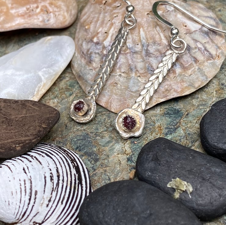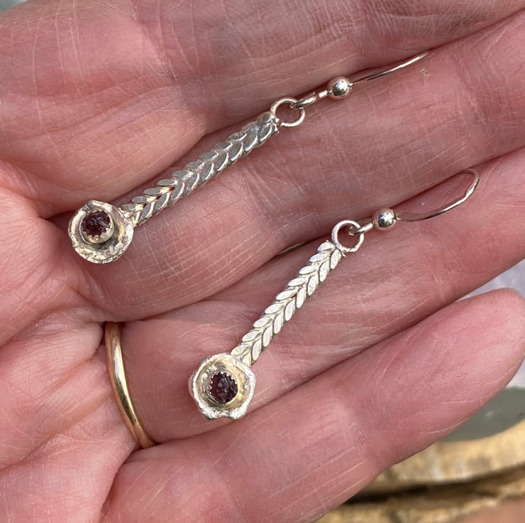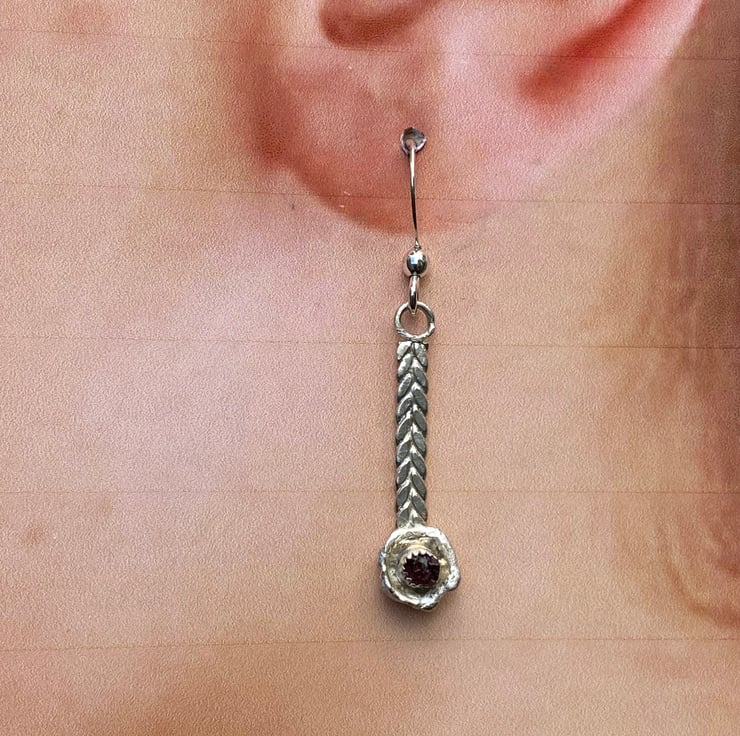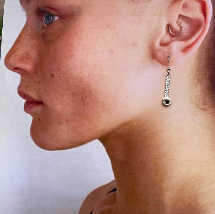 Braided silver (like a Viking plait), with a water-cast cup and a Thames garnet. Unusual, light and pretty OOAK earrings.